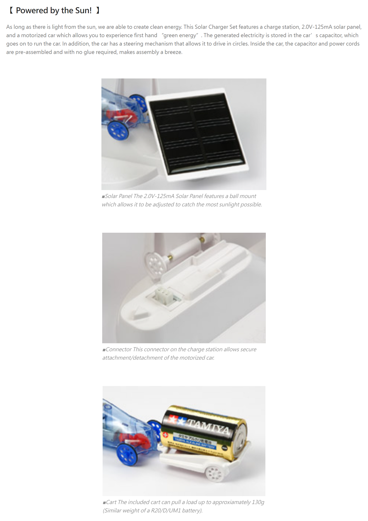 This Solar Power Generator Set is perfect for young children and educational purposes.Electricity generated by the solar panel is charged in a capacitor installed in the car model.