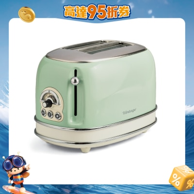2-slice vintage toaster without pliers to toast simple slices or filled sandwiches, with auto eject and removable crumb tray, 6 levels of browning, cool touch sides and defrosting, heating and cooking function.