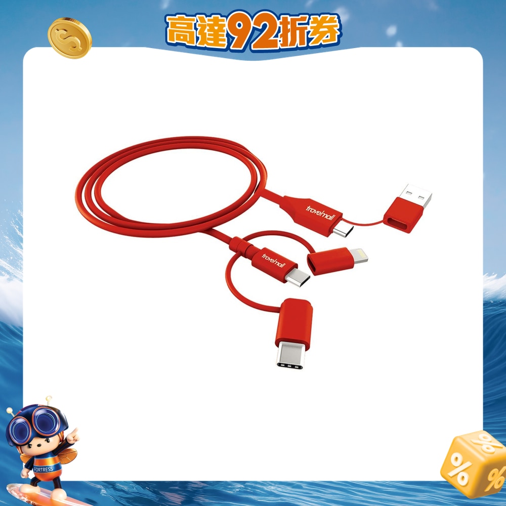 This 5-in-1 charge and sync cable is suitable for everyday use or travel. 1 meter long. One end features Lightning, Micro-USB, and USB-C connectors, while the other end with USB-C and USB-A connectors, making it compatible with most phones.