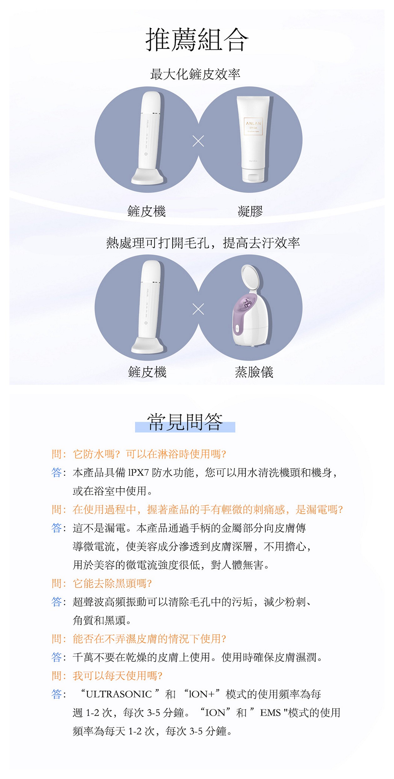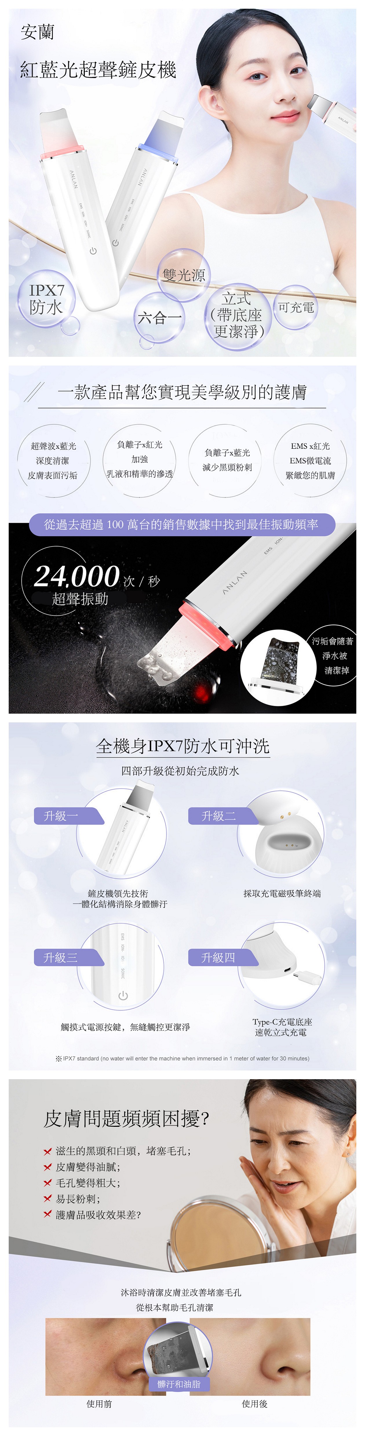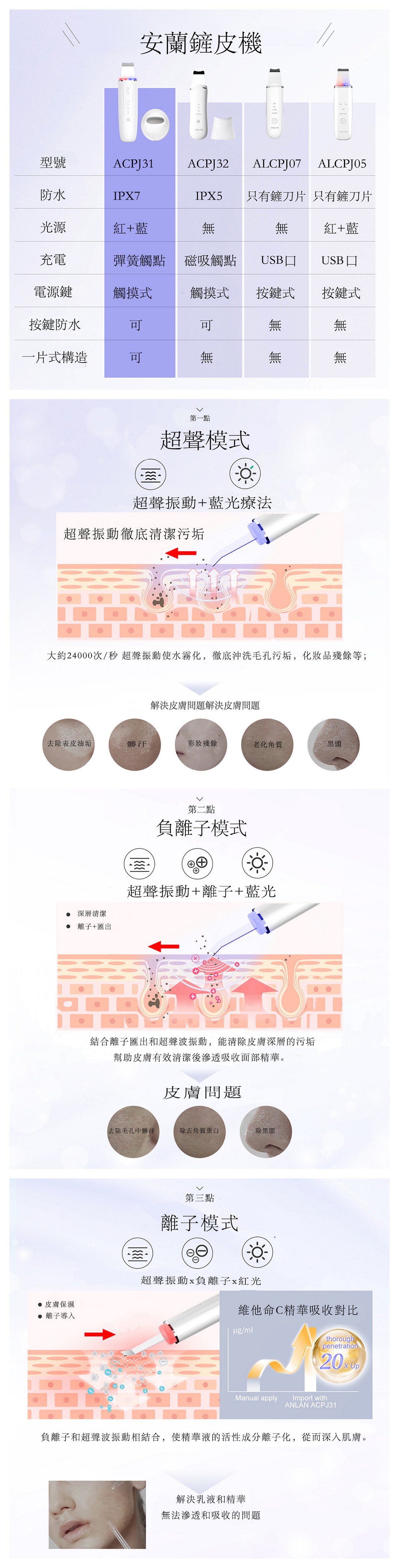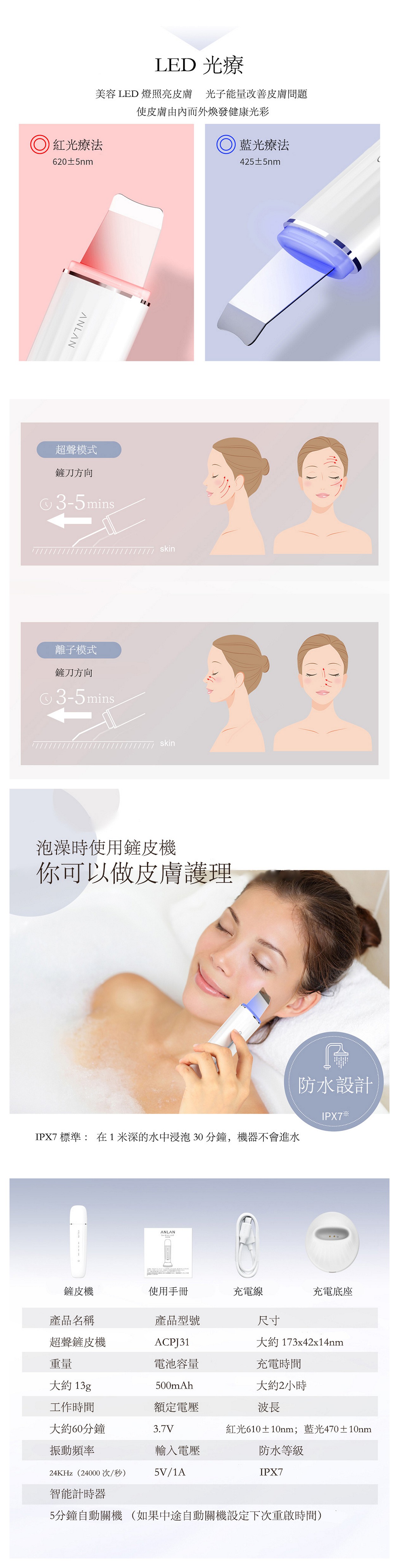 The ACPJ31-02A features deep cleansing (ultrasonic + positive ions), red/blue light therapy, nutrient delivery (negative ions) + EMS firming. It’s IPX7 waterproof, with a "place-and-charge" base for safety and convenience.