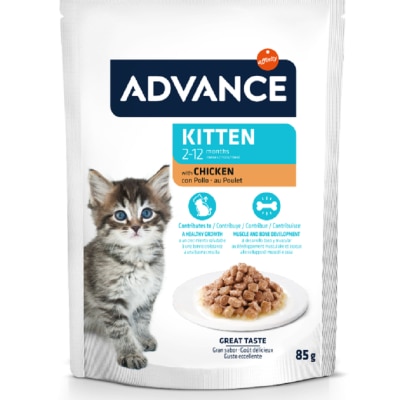 Contributes to a healthy growth: formula rich in essential nutrients, such as fatty acids, minerals, vitamins and proteins. Contributes to muscle and bone development: minerals and high level of protein. If your kitten is less than 1 year old, it is in the stage during which it experiences the most physical and behavioural changes, thus he needs a specific product that will help it him to grow strong and healthy. ADVANCE Wet Kitten is a complete & balanced wet recipe specifically formulated to cover the needs of kittens. Its formula has been developed by nutrition experts to contribute to your kitten’s muscle and bone development and support a healthy growth. ADVANCE Wet is made with steam cooked high quality ingredients, and is offered in a chunks in gravy texture that makes it easier for kittens to chew. Combine it with your cat’s daily dry kibbles for more taste and variety, or fe