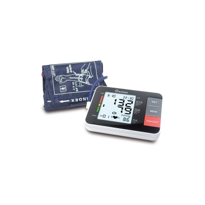 Arrhythmia indication/ Jumbo backlight LCD easy read/ One-touch auto measure/ WHO BP classification/ 90 memories/ Shows SYS DIA pulse date time/ Range 0–299mmHg/ Average reading/ FDA certified