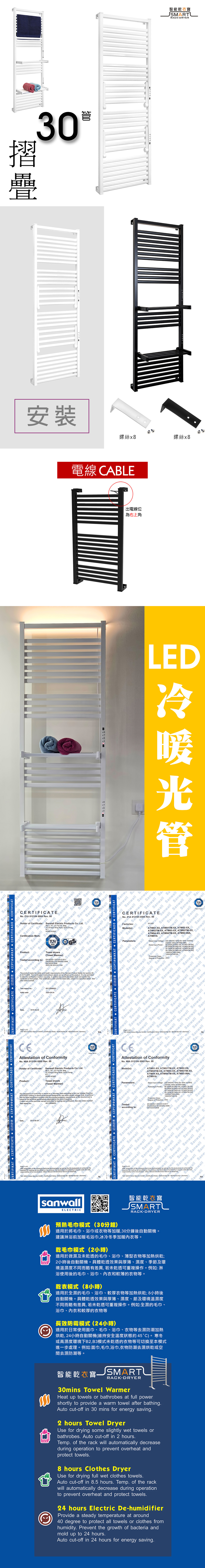 30 pipe wall mounted folding small, Electric Tower warmer. The movable platform can also generate heat and can be used to place other bathroom objects during limited placement periods. Comes with top LED lighting, heating and cooling switch