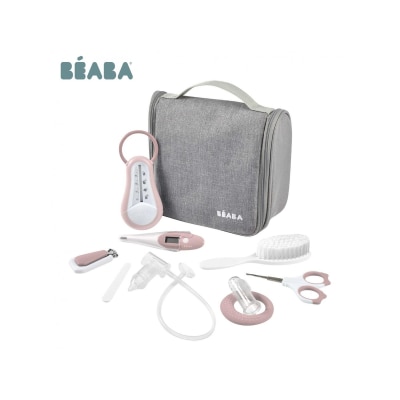 Nine essential accessories to wash and care for baby: bath thermometer, digital thermometer, scissors, nail clippers, hair brush, teething ring, gum brush, baby nasal aspirator, nail file.