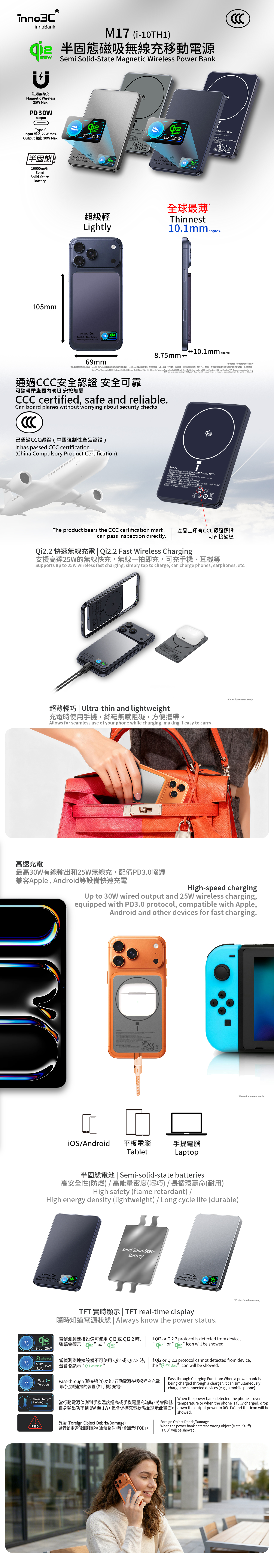 World's thinnest 10.1mm 10000mAh semi-solid power bank, CCC & CE certified. Support qi2.2 25W magnetic wireless & Type-C 30W fast charge. Smart management, multi-safety protection, TFT display, & multi-device charging for secure efficiency.