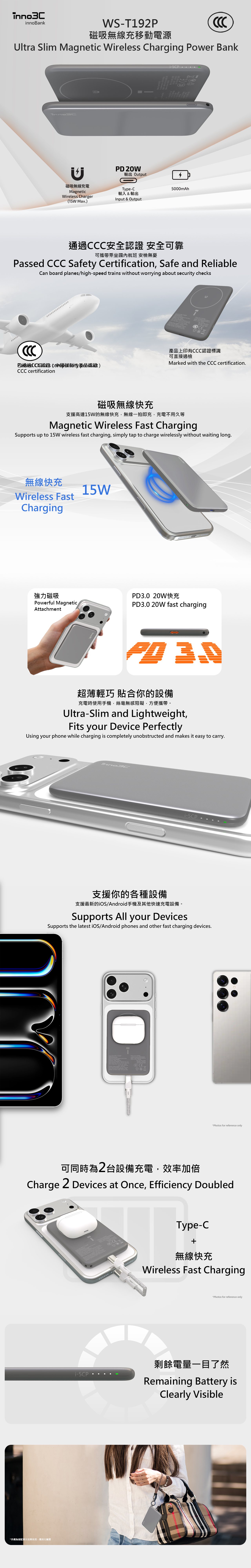 CCC & CE certified slim power bank with 15W wireless fast charge and Type-C PD3.0 two-way charging compatible with Apple, Android and more. Secure magnetic design, supports wired and wireless output, multi-layer safety protection.