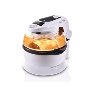 Revolutionary 3D rotation for 360° heating.Advanced air circulation technology. Flameless and smokeless oil-free frying.Transparent lid for easy monitoring 4 free cooking accessories. 9L sizeable capacity, fitting large poultry