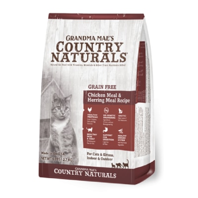 Country Naturals Grain Free Chicken Meal & Herring Meal Recipe for Cats & Kittens Production size : 3lb/6lb/12lb Our Chicken Meal & Herring Meal Recipe is a non-GMO, grain free dry food made with the highest quality chicken meal and herring meal—two of cats’ favorite proteins. Like all our cat foods, this recipe is Uristic, a word that means optimized for long term urinary tract health. The formula’s 1% Methionine, found naturally occurring in our fresh ingredients and supplemented to optimal levels, raises the acidity of urine. This helps break down urine crystals and in turn reduces inflammation of the urinary tract and the chance of infections. Ingeredients : Chicken Meal, Peas, Lentils, Chickpeas, Chicken Fat (preserved with mixed tocopherols), Herring Meal, Dried Eggs, Menhaden Fish Oil, Dried Kelp, DL-Methionine, Calcium Carbonate, Lecithin, Choline Chloride, L-Lysine, Taurine,