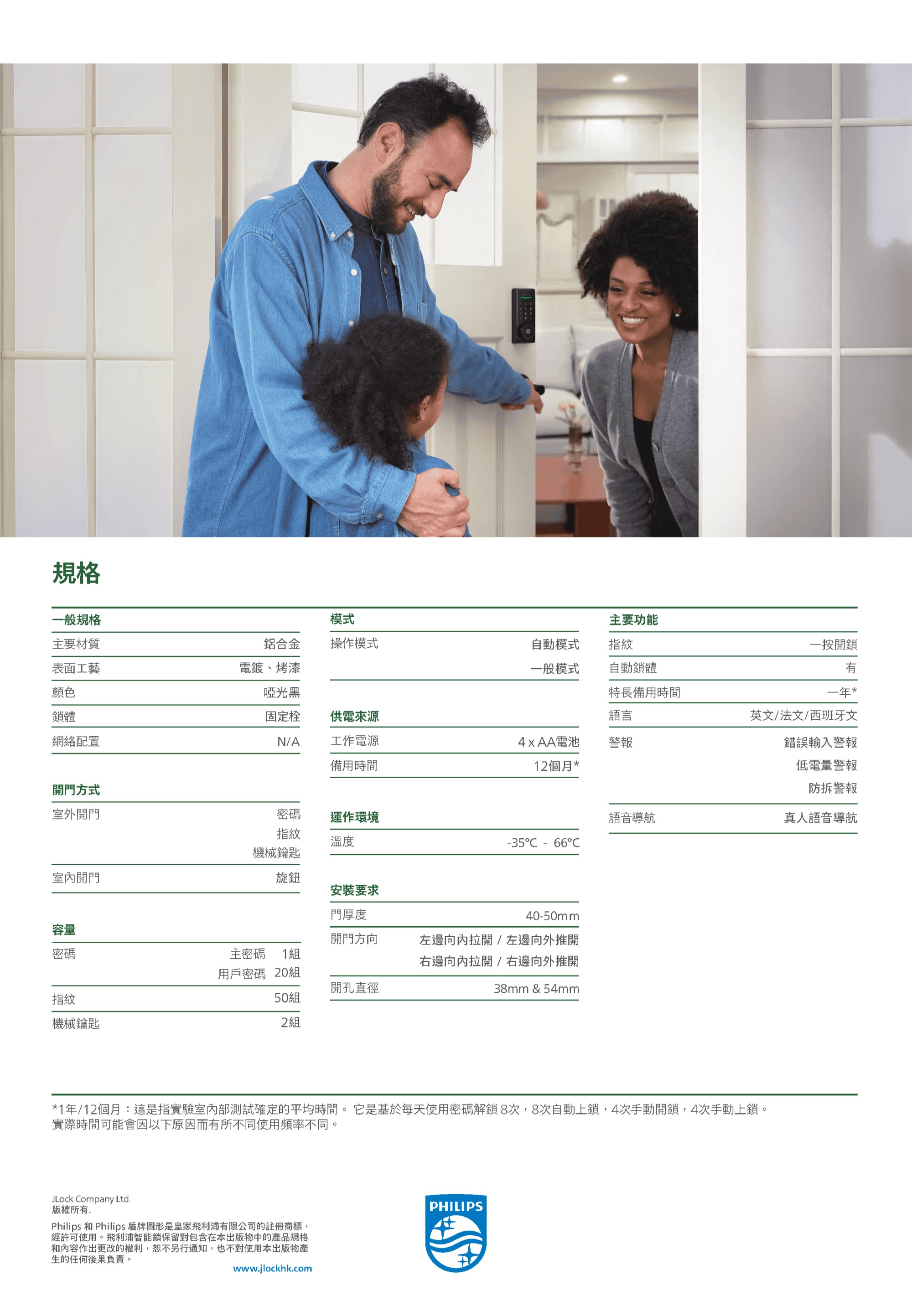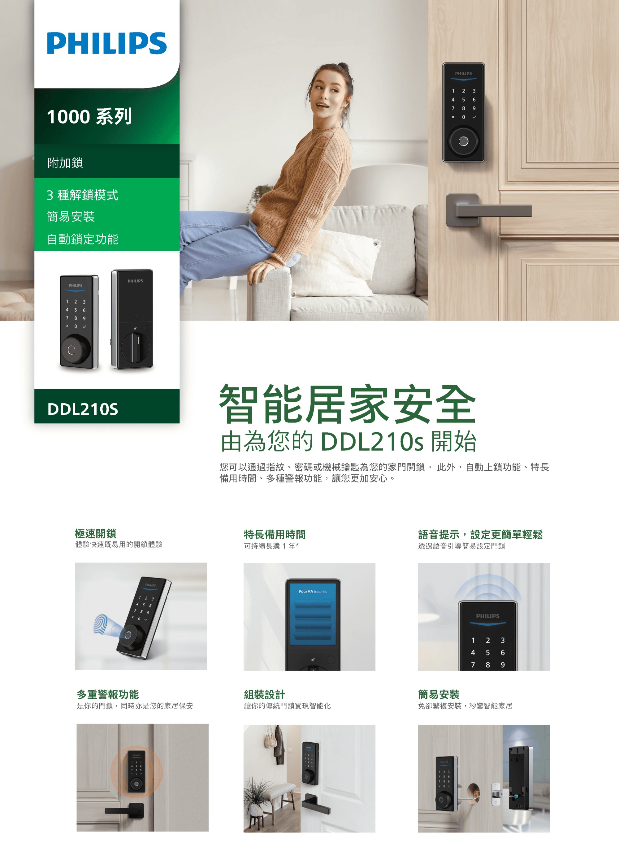 Philips DDL210s Deadbolt Smart Lock featuring a variety of access methods, you can unlock this lock by fingerprint, PIN code or a mechanical key. Besides, auto-lock, ultra long-life battery and multiple alarm functions