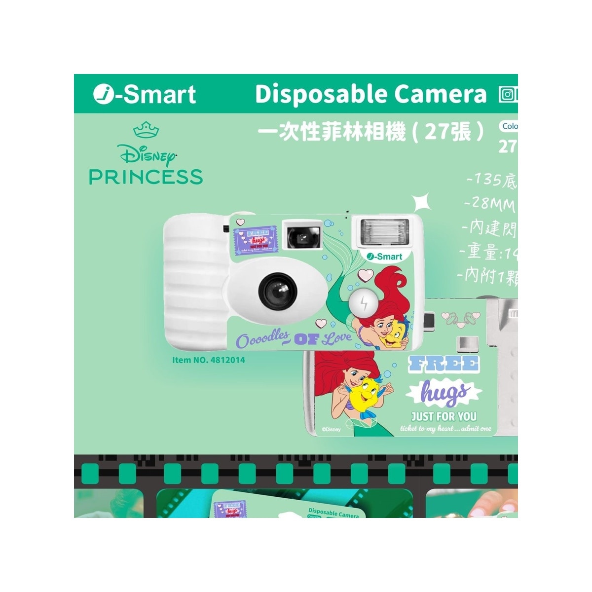 Ready-to-use disposable film camera / Compact and lightweight, easy to carry and store / Film format: 135 negatives / 35 mm film / 27 shots / Product size: 11 x 6 x 2.8 cm / Product weight: 145g