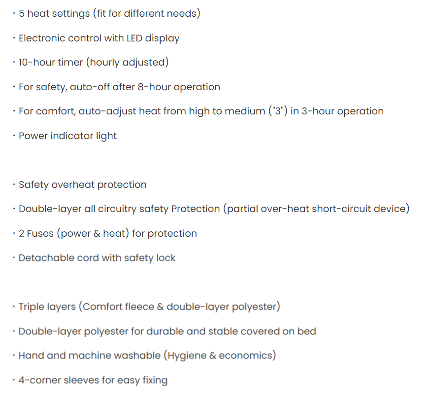 Comfort Fleece (Timer) Electric Under-Blanket Single/ Hand or Machine Washable,Triple layers: Comfort fleece & double-layer polyester, size:150x80cm, 5 heat settings setting, overheating safety protection device, safe and reliable