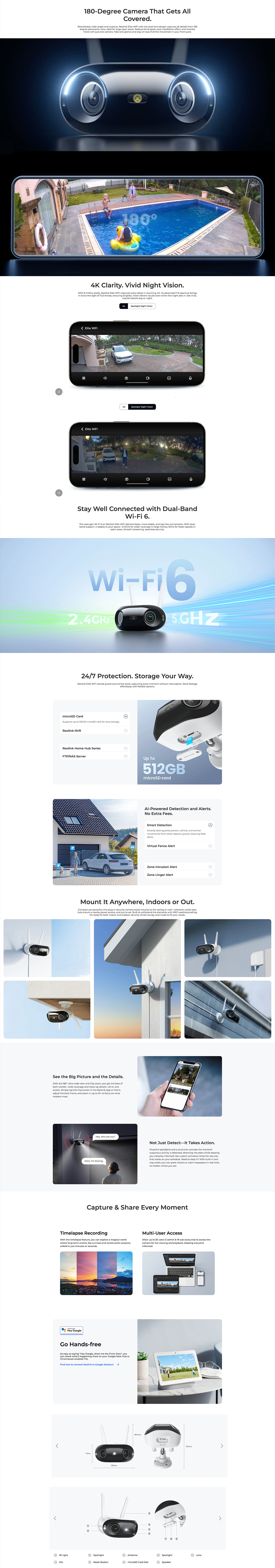 Reolink Elite WiFi Smart 4K 8MP Dual-Lens Plug-in Security Camera, 180° Panoramic Ultra-Wide View, Color Night Vision. Built to withstand the elements with IP67 weatherproofing, it’s ready for both indoor and outdoor security.