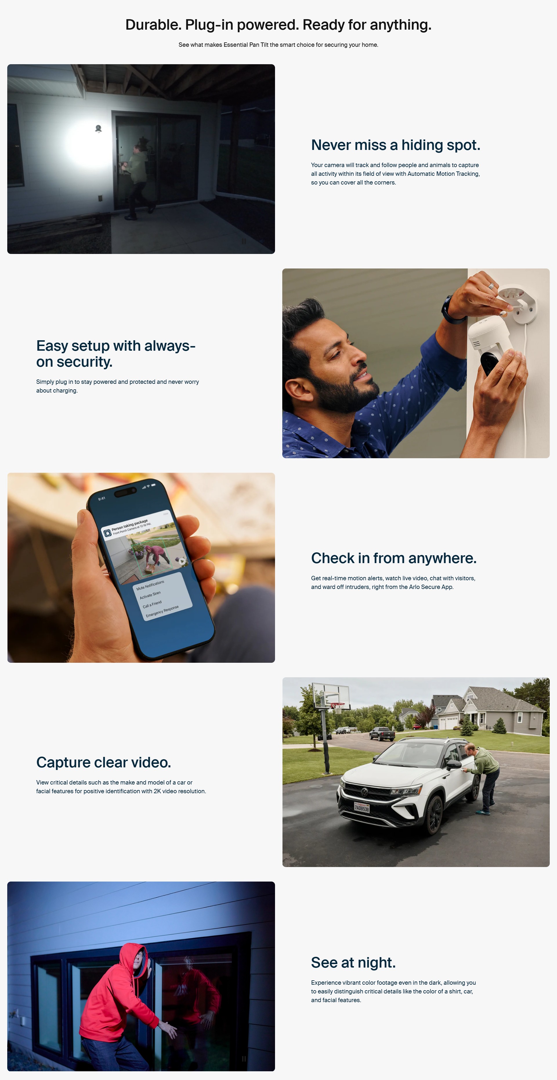 Get sharp 2K video, 360º coverage, and nonstop plug-in power to protect your home, family, and pets. Smart Detection and Advanced Audio Alerts keep you aware of people, vehicles, packages, and important sounds.
