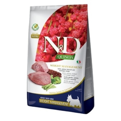 N&D QUINOA WEIGHT MANAGEMENT - Lamb, quinoa, broccoli and asparagus recipe for adult dogs is formulated to meet the nutritional levels established by the AAFCO Dog Food Nutrient Profiles for maintenance.