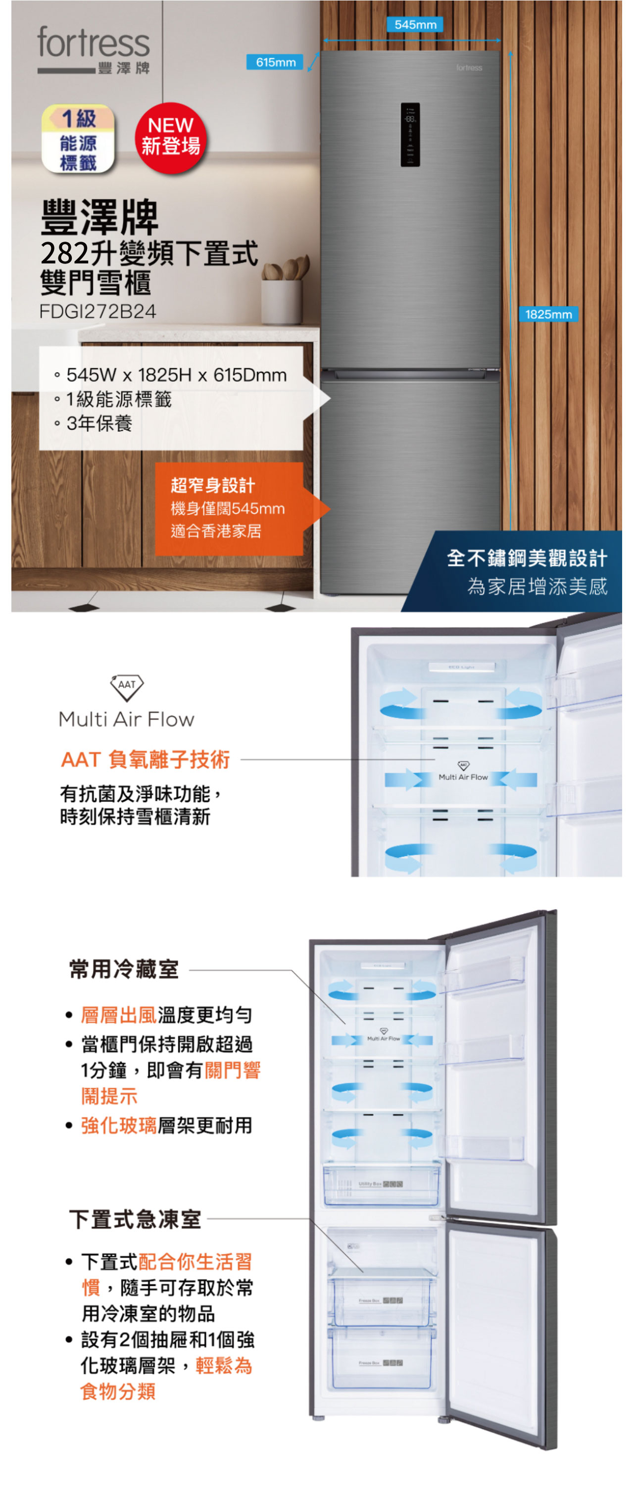 2-Doors 272L fridge with Grade 1 MEEL label. Spacious 69L bottom freezer for more food storage. Multi-layer air system results in consistent temperature. Tempered glass shelves. 3 years warranty.