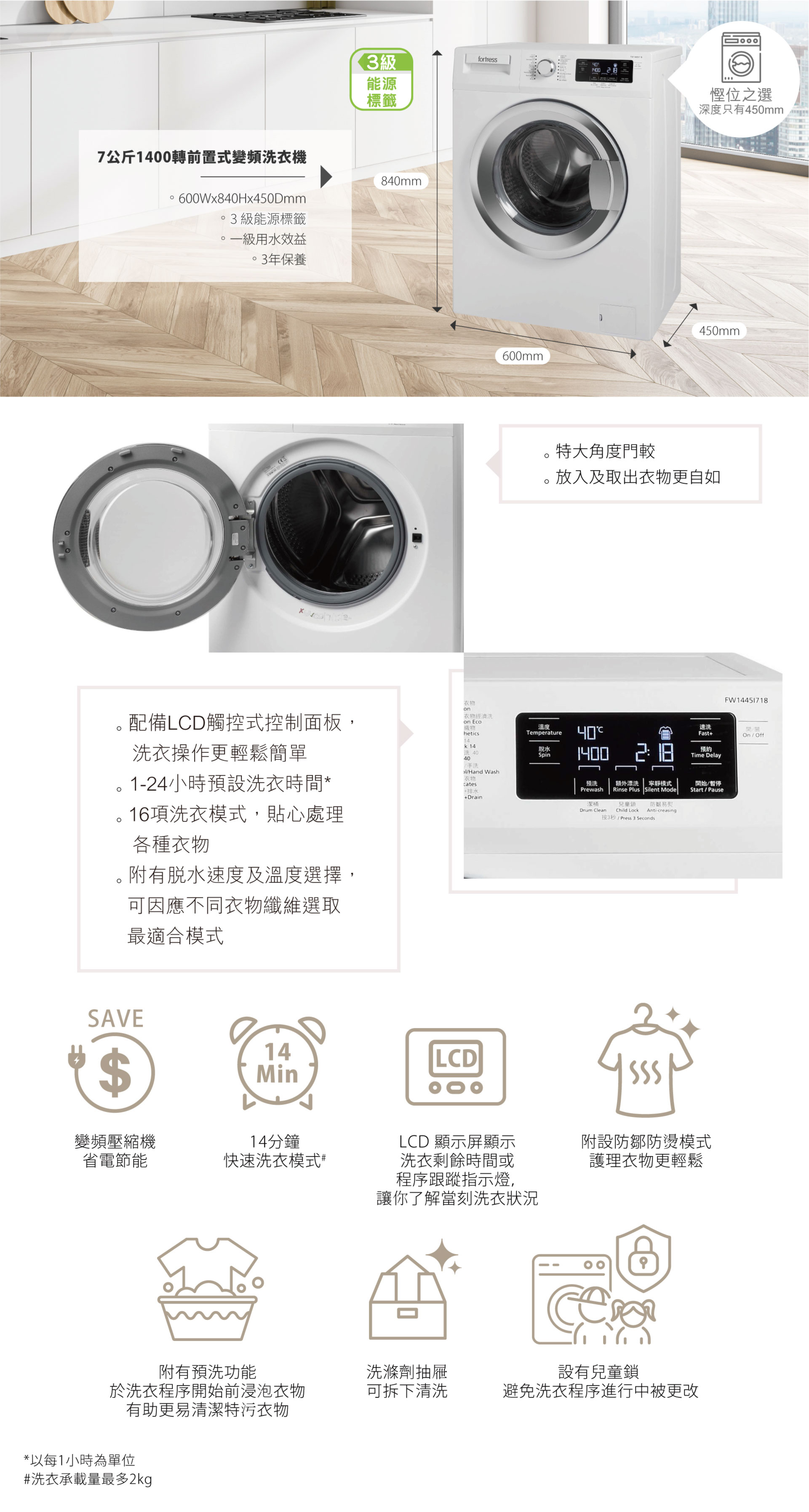 FW1445I718 7KG 1400RPM Inverter Front Load Washer
