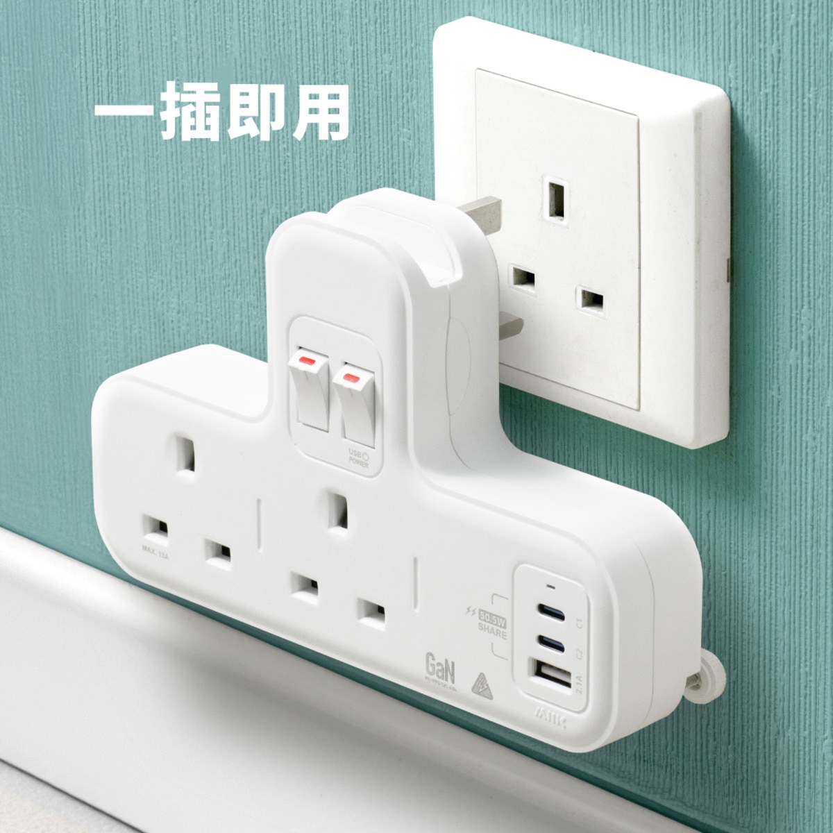 The 5-in-1 Universal Plug Adapter has two 13A UK sockets + 2 USB-C and 1 USB-A ports. Single USB output reaches PD 36W. Three USB ports share 50.5W total (C1: PD20W, C2: PD20W, A: 2.1A). Compatible with PD3.0, PPS, QC4+, QC3.0, AFC FCP.