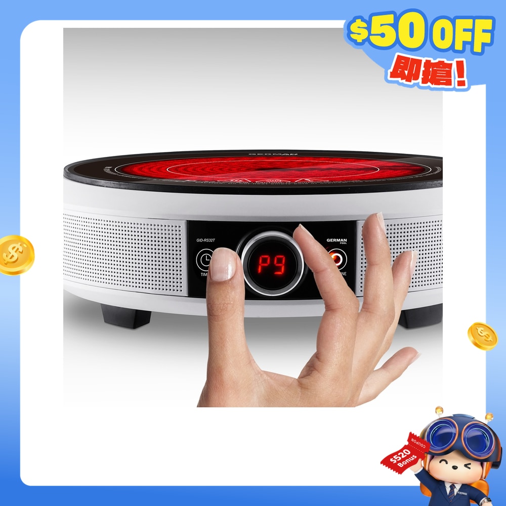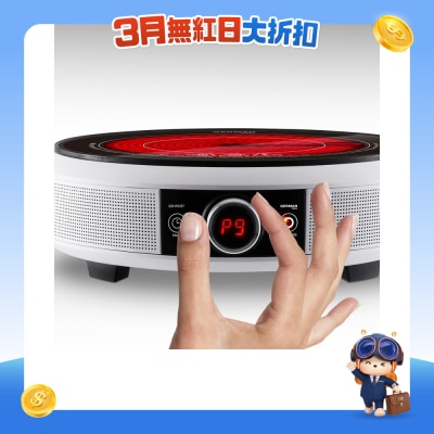 2200W strong power output,Cook with pots and pans of any material *,Max. 13-level power control,Dual infrared heating rings,Turn knob and touchscreen panel for easy control,Slim and compact design,13A socket, plug-n-cook