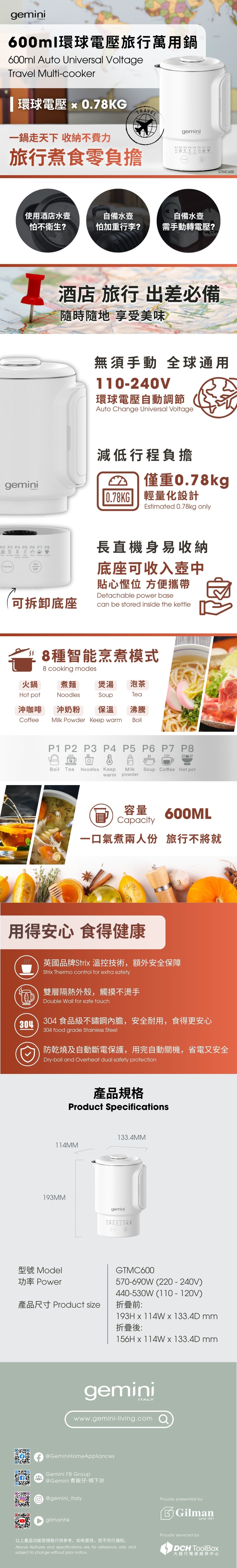 GEMINI GTMC600 600ML Auto Universal Voltage Travel Multi-Cooker / Auto Universal Voltage / 8 Pre-set Programs / 304 Stainless Steel inner pot