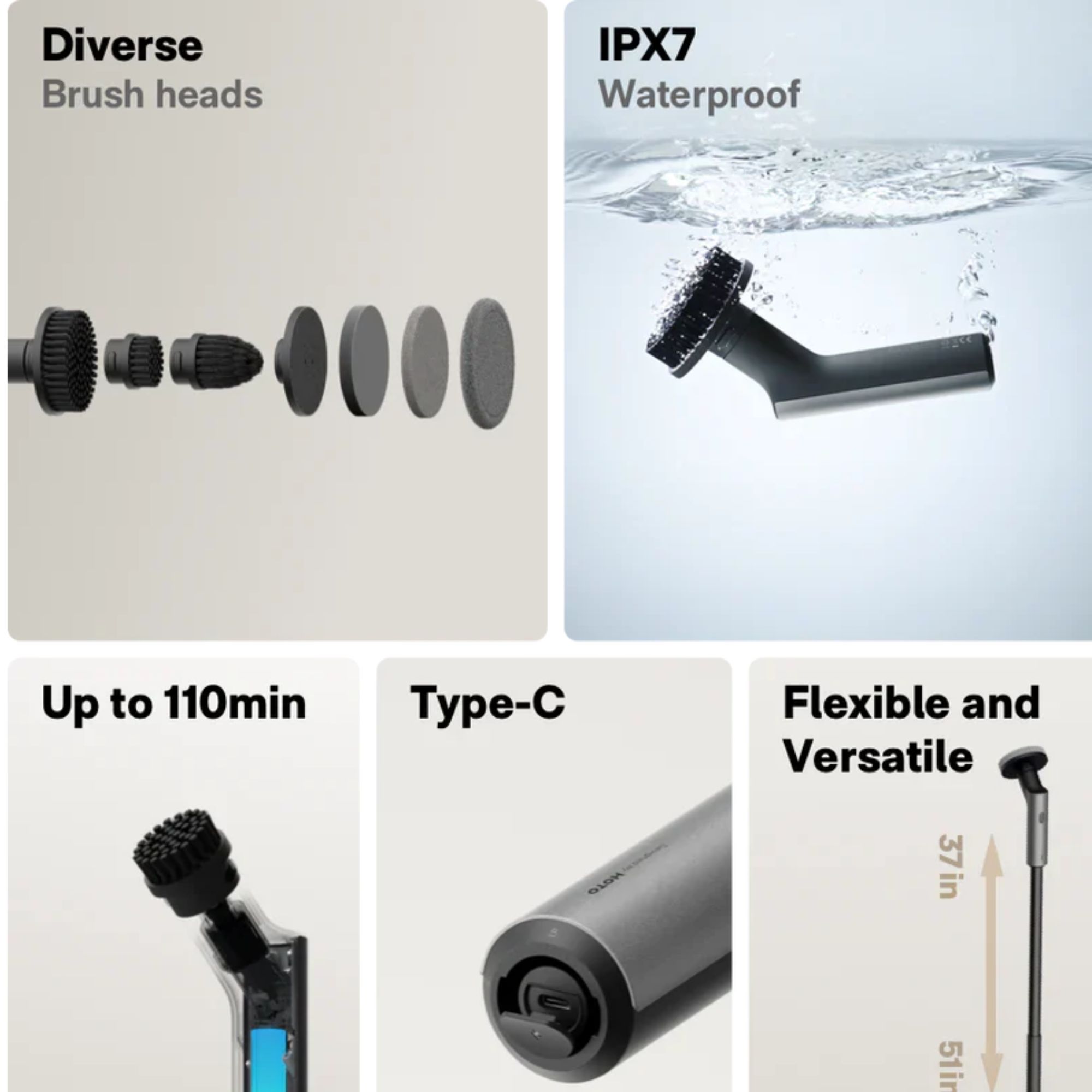 Effortlessly clean with high-speed motor, interchangeable brush heads, adjustable speed, waterproof