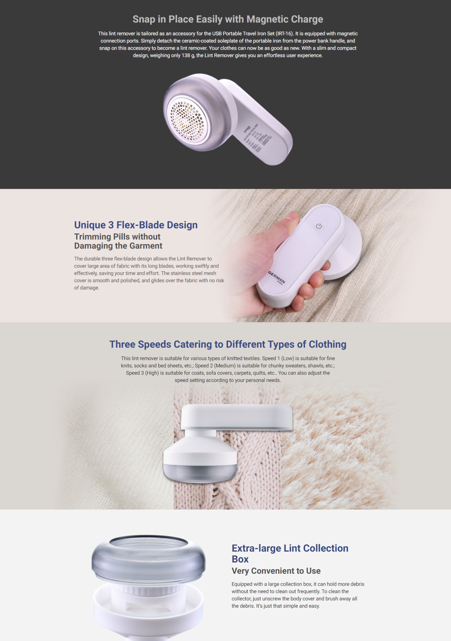 Designed for USB Portable Travel Iron Set (IRT-16),Magnetic ports for easy attachment,Durable three-blade design for efficient lint removal,Three speed settings for various clothing types,Extra-large lint collector