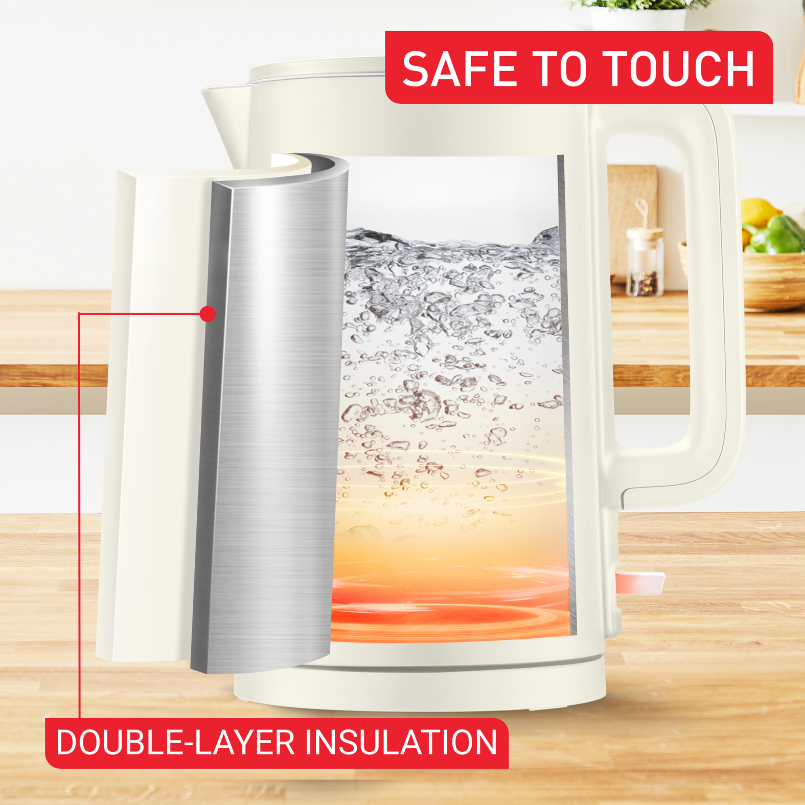 1.5L, double layer insulation, Outside safe to touch, Auto-off function and indicator light for total safety and peace of mind, Stainless steel precision spout for drip-free pouring, 1500W