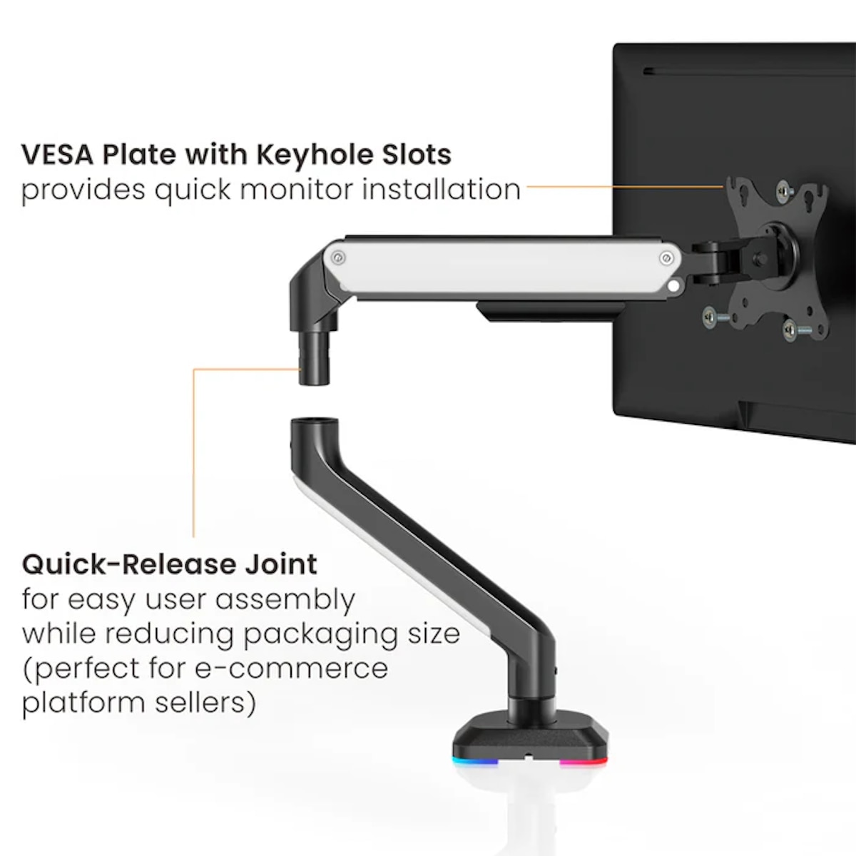 RGB multi-color Lights, cool ambient lighting/Cable management for an organized & neat workspace/Spring-Assisted mechanism, easy to move up & down/Keyhole pattern, easy to install/180° Rotation stop to avoid monitor arm from swinging/