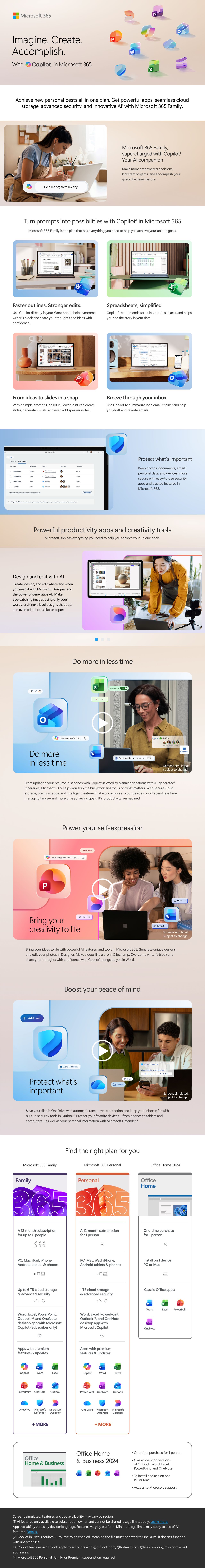 Get the power of Copilot* in Microsoft 365. Premium versions of Office apps,1 TB OneDrive cloud storage. Works on Windows, macOs, ios, and Android. (*Al features only available to subscription owner and can’t be shared/ usage limits apply.)