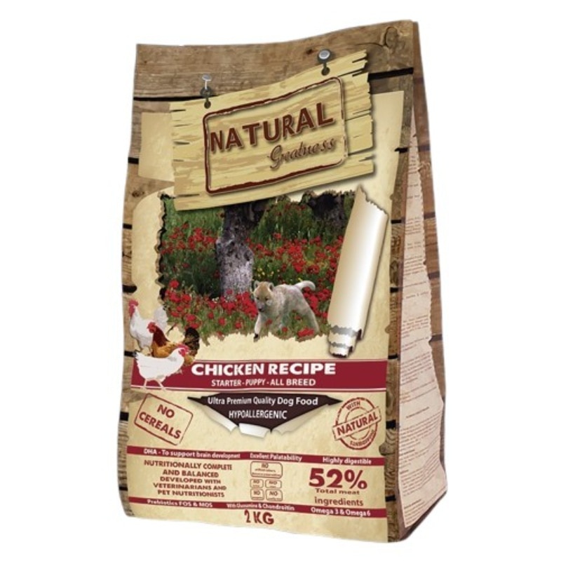 Natural Greatness CHICKEN RECIPE is an excellent ultra-premium and hypoallergenic recipe formulated without cereals, designed for puppies from weaning to 12-18 months of age. It is also excellent for pregnant and lactating females and adults of small and medium-sized breeds. Its ingredients promote muscle development and provide energy for the proper growth and development of the puppy. All our food is prepared using a highly advanced natural cooking process based on the direct injection of fresh meat. The quality of the natural ingredients used in our recipes provides them with high levels of palatability and digestibility.