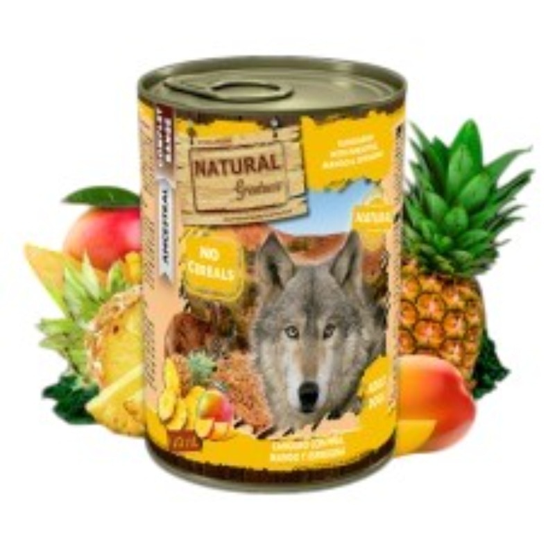 Natural Greatness KANGAROO WITH PINEAPPLE, MANGO AND SPIRULINA is an excellent complete, ultra-premium and hypoallergenic wet recipe, formulated without cereals and ideally developed for adult dogs. This wet food has a high palatability thanks to the high quality of its ingredients, among which kangaroo stands out as the only source of animal protein, a delicious meat for the most demanding palates. In addition, this delicious meat is accompanied by superfoods such as pineapple, mango and spirulina, which improve the flavor and provide extra vitamins and minerals to complete this rich and nutritious wet food recipe for adult dogs.