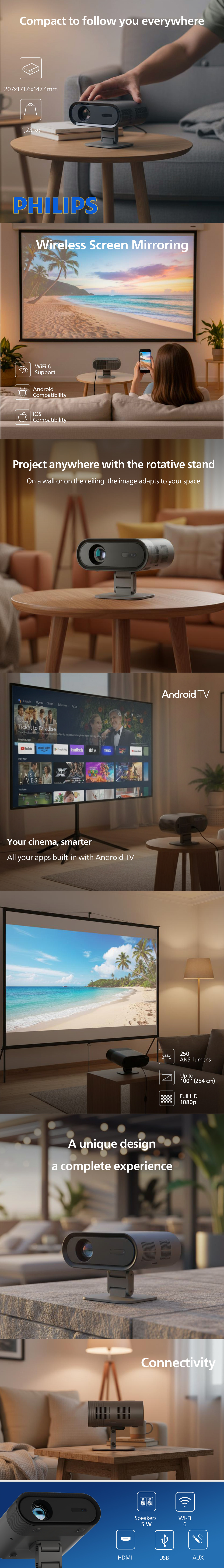 Compact to follow you everywhere,True Full HD 1080p,250 ANSI lumens, Autofocus, auto-keystone & 4-corner correction, Android TV,adjustable stand,Wi-Fi Screen Mirroring,Multimedia Player,HDMI,USB-A,3.5 mm audio out, 30,000-hour LED lifetime
