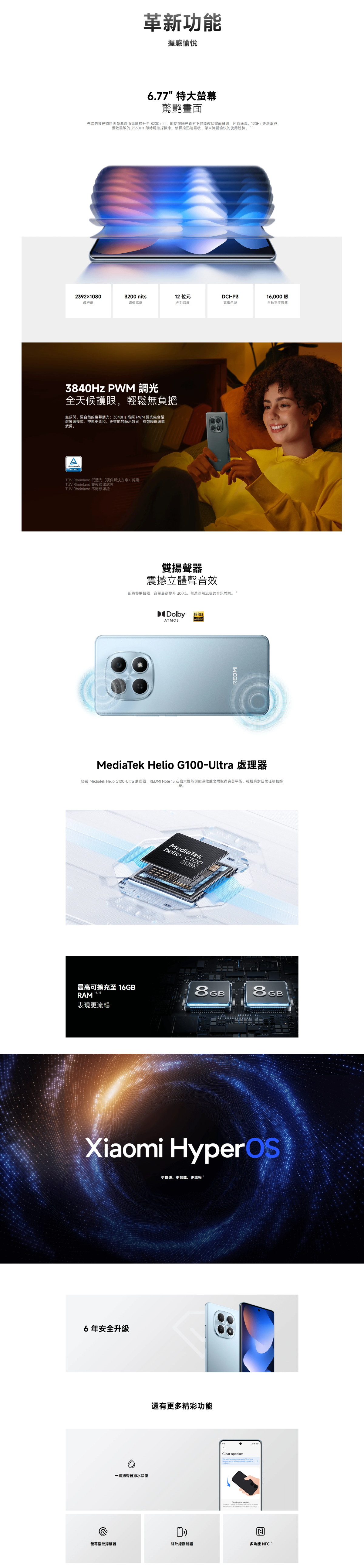 Massive 6000mAh battery High-durability display glass IP64 dust and water resistance 108MP super-clear camera 6.77" FHD+ AMOLED display MediaTek Helio G100-Ultra