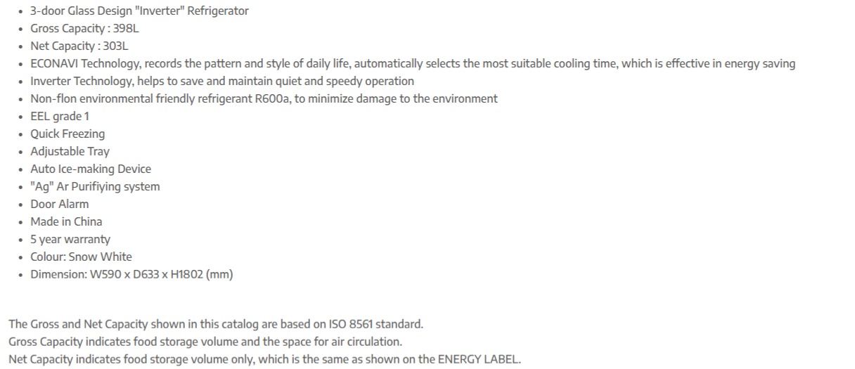 Current Item PANASONIC NR-C370GH 303L ECONAVI 3-door Refrigerator (includes unpacking and moving appliance service) Snow White / 303 / right HK$ 7,090 RRP HK$9,680 | Stainless Steel HK$ 5,690 RRP HK$6,630 | MITSUBISHI MR-CGX46EN 298L 3-Door Inverter Refrigerator (includes unpacking and moving appliance service) Glass Antique Brown / 298L / right HK$ 7,190 RRP HK$8,380 | MITSUBISHI MR-CGX41EN 266L 3 Door Inverter Refrigerator (includes unpacking and moving appliance service) Glass Antique Brown / 266L HK$ 6,190 RRP HK$7,880 | |