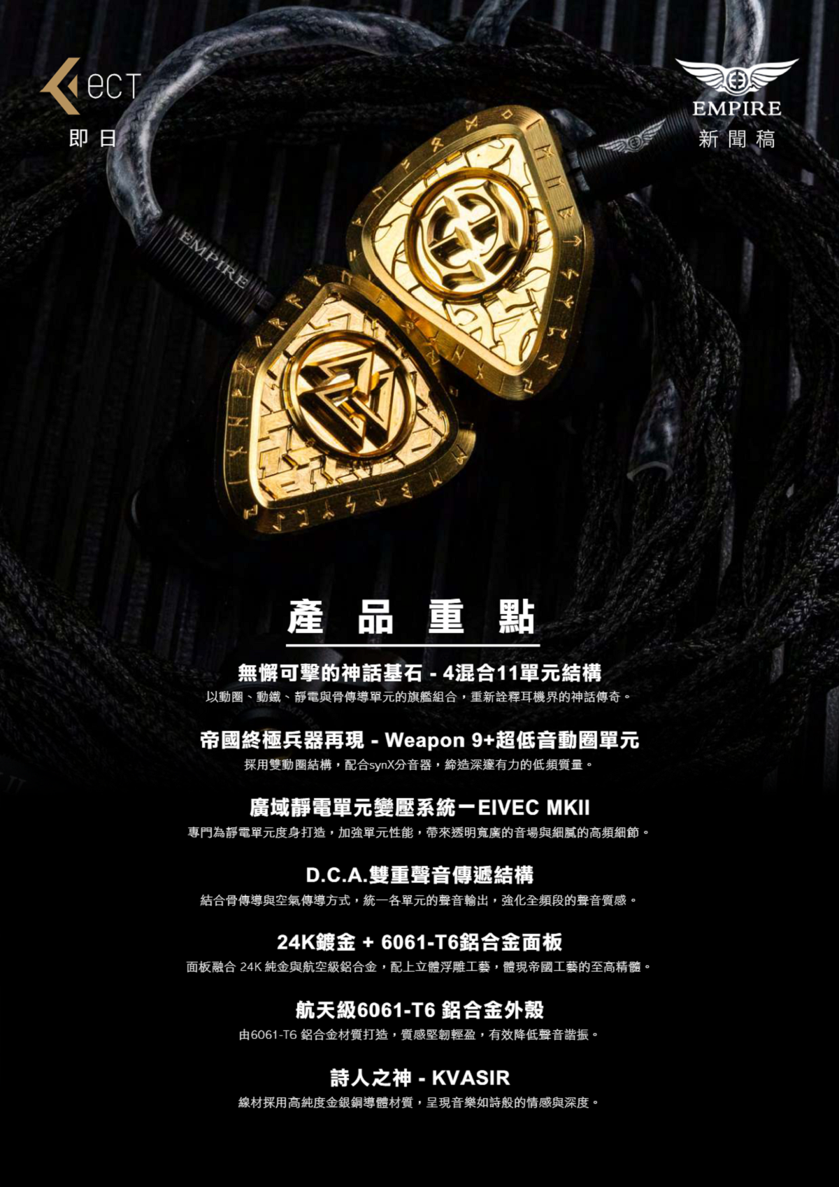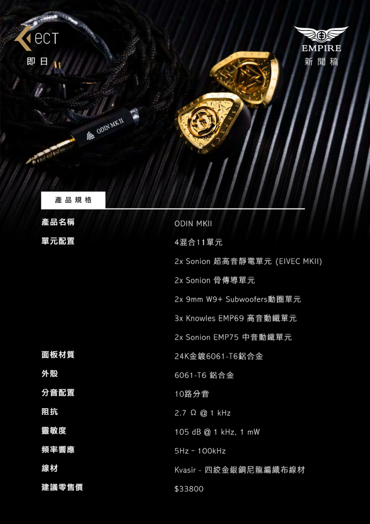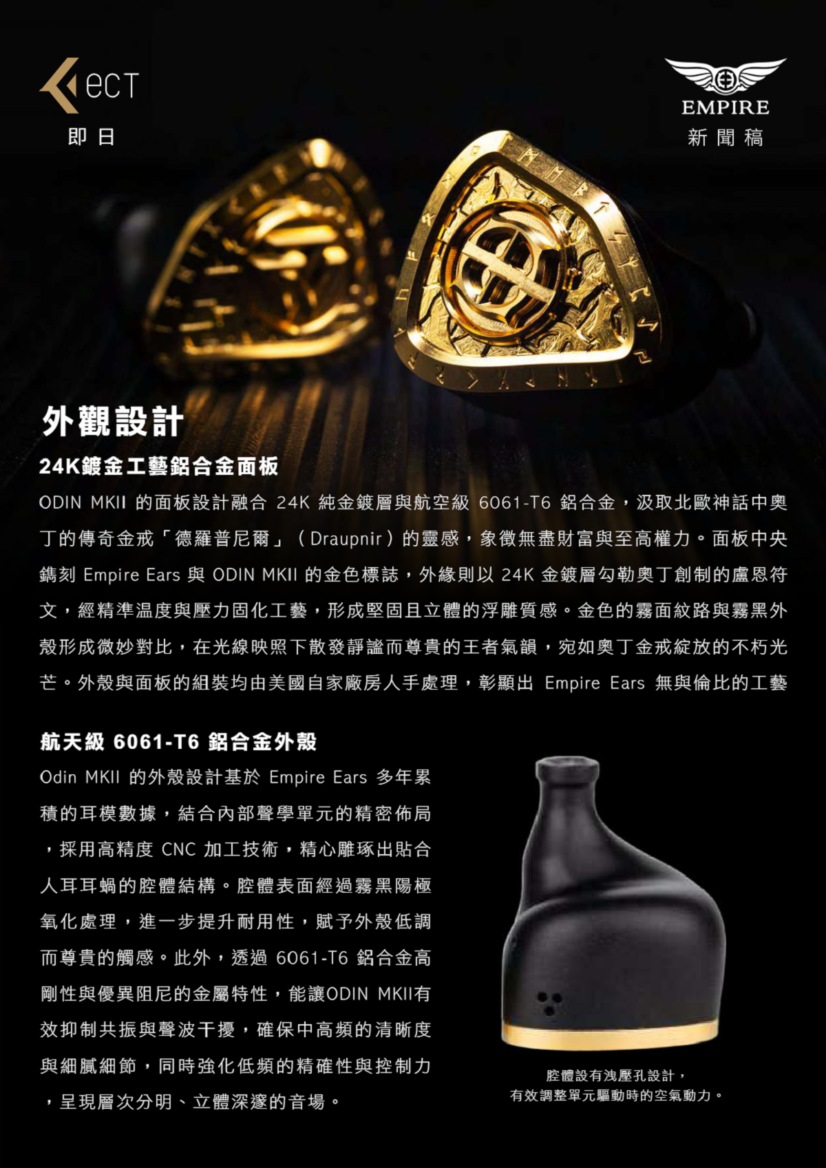 ODIN MKII is equipped with a unit structure of 2 dynamic coils, 5 balanced irons, 2 electrostatics and 2 bone conduction. black shell is made of aviation-grade 6061-T6 aluminum alloy, 6061-T6 aluminum alloy + 24K gold-plated panel is used.