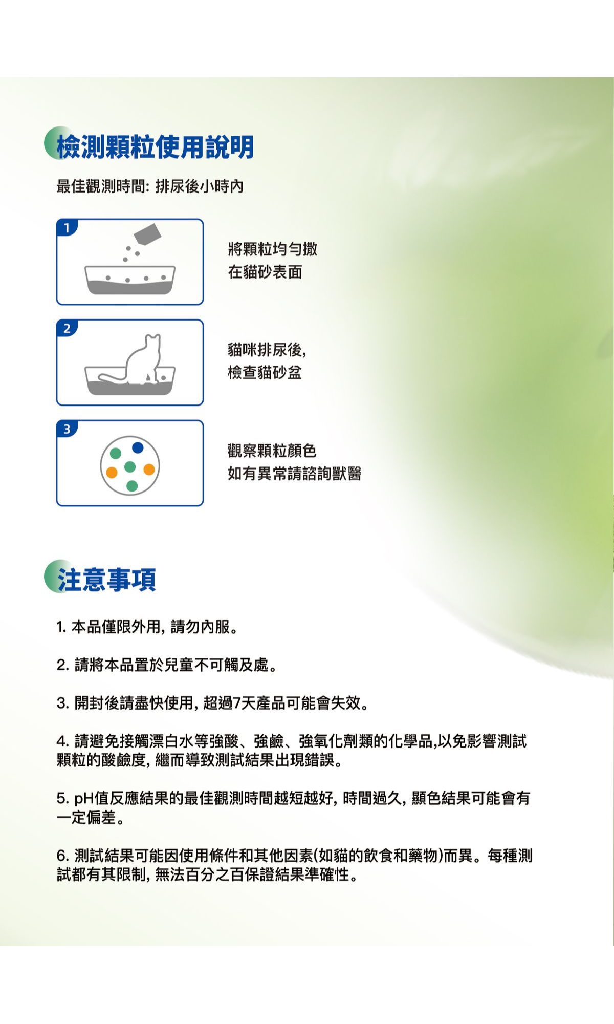 The pH-detecting granules display different color changes depending on the acidity or alkalinity of a cat’s urine. By observing the color variation of these granules, owners can easily determine the urine’s pH level.