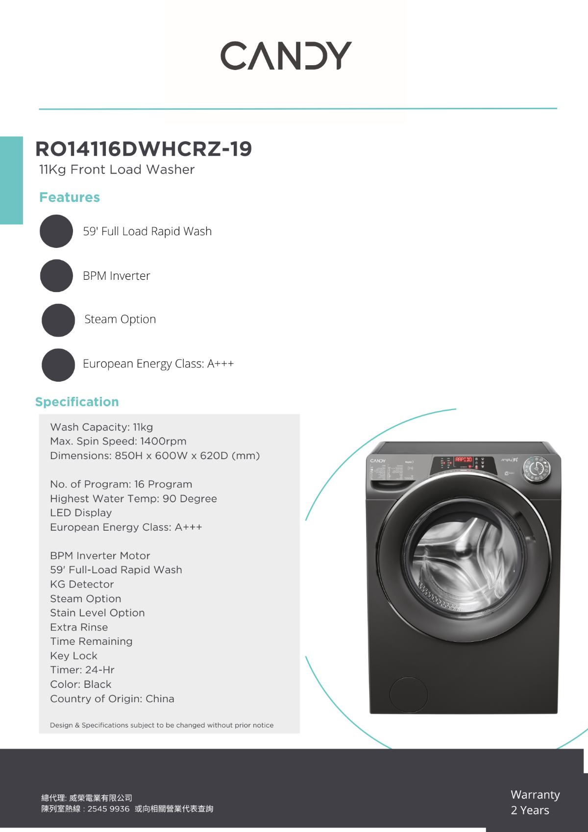 Candy RO14116DWHCRZ-19 11Kg/1400rpm Front Load Washer / BPM Inverter / 59‘ Full-load Rapid Wash / Steam Option