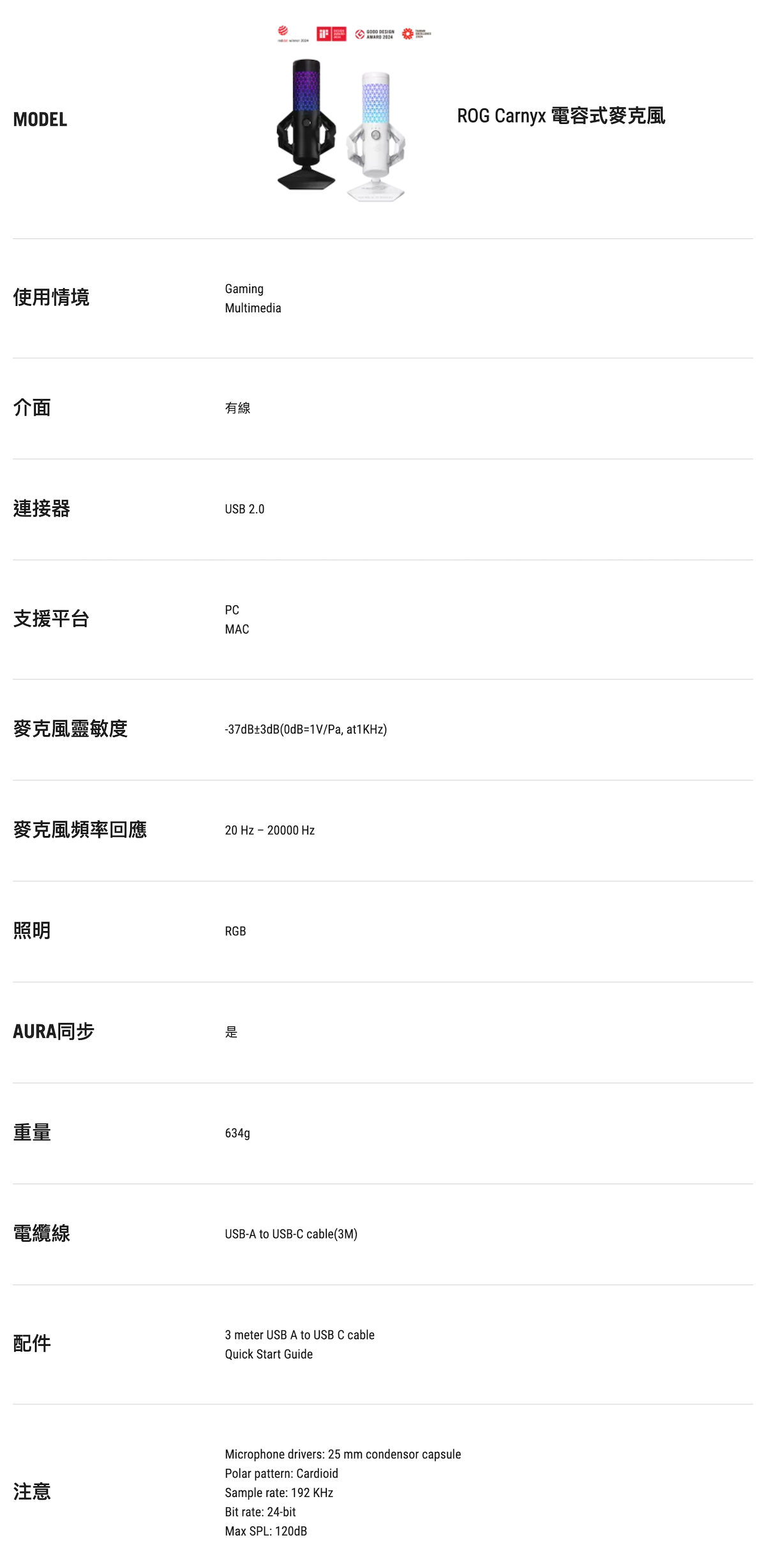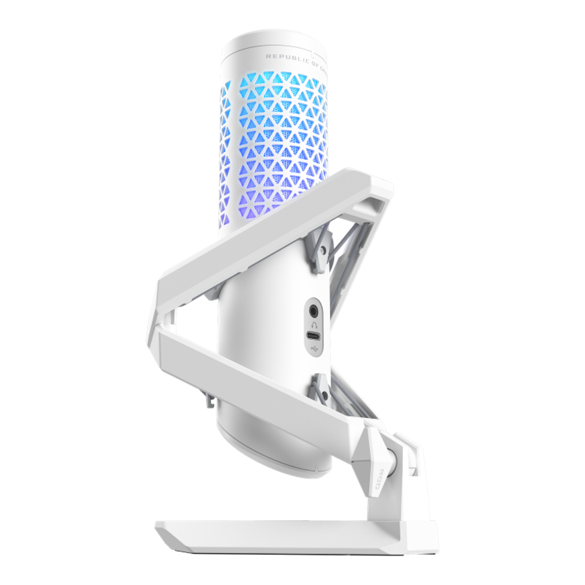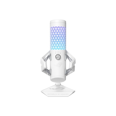 Professional cardioid condenser gaming microphone features a studio-grade 25 mm condenser capsule, 192 kHz / 24-bit sampling rate, high-pass filter, built-in pop filter, premium metal shock mount, and ASUS Aura Sync RGB lighting.