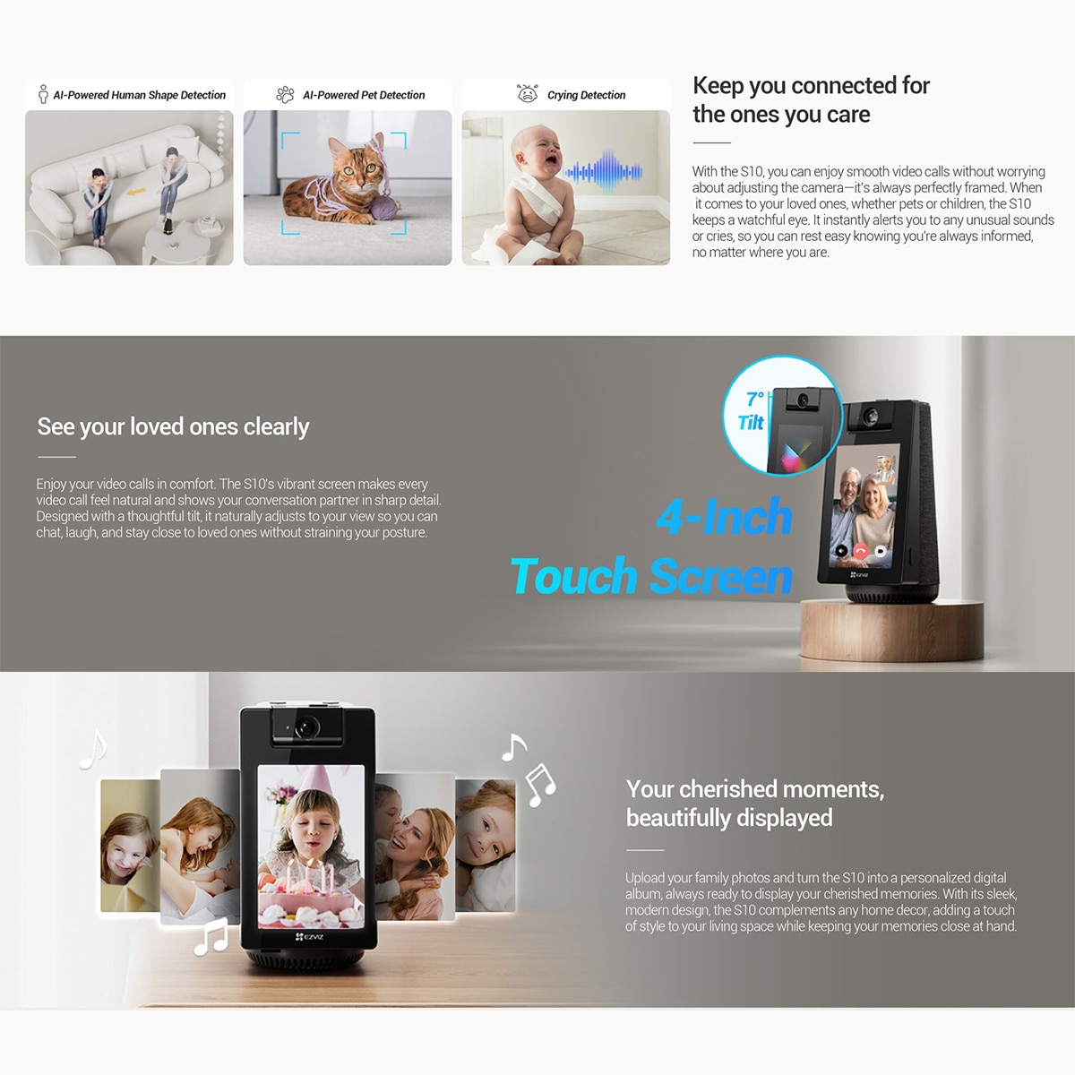 S10 is EZVIZ's first smart video camera with a 4-inch touchscreen for calls. It features a 2K+ resolution (1504×2672), a gimbal lens with an F1.6 4mm aperture and a 100° field of view. It can supports up to 512GB MicroSD cards.