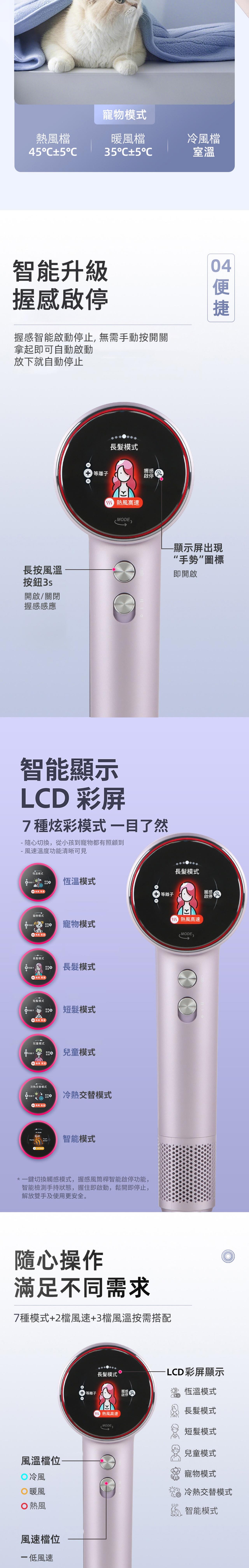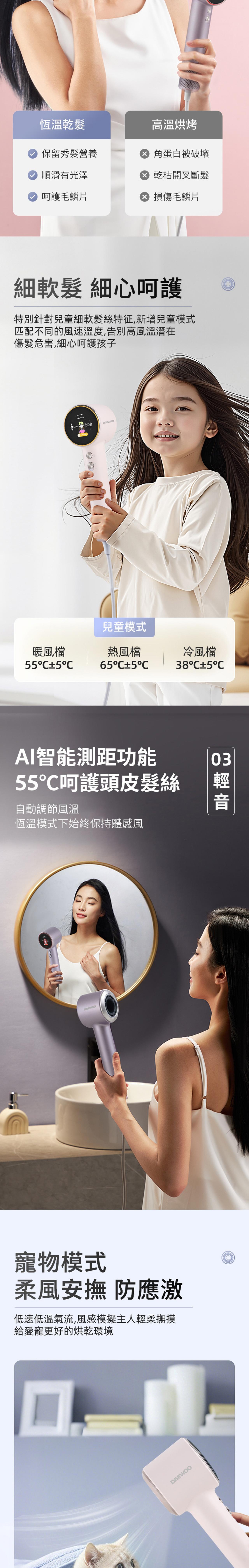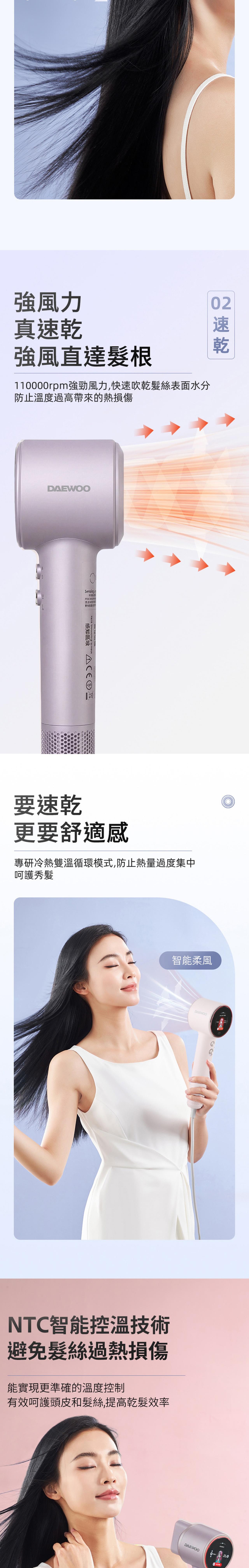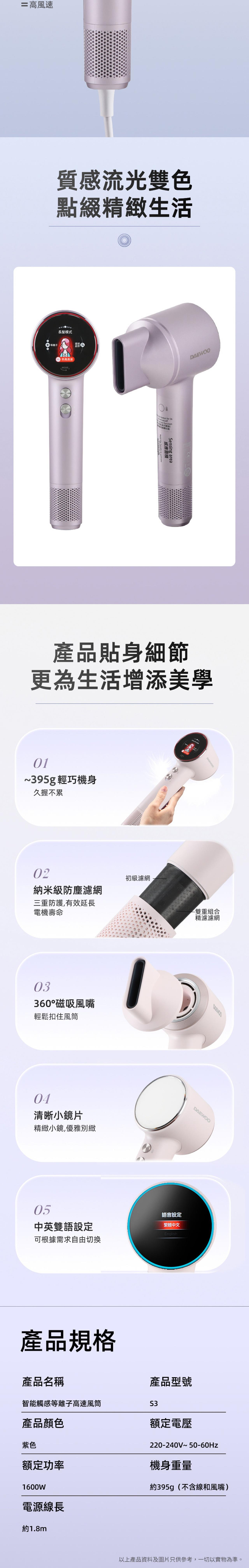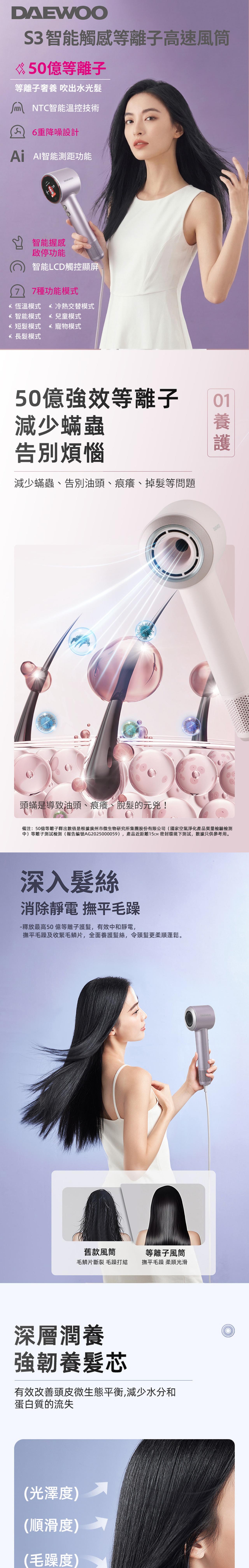 S3 has high-concentration plasma up to 5 billion, which completely eliminates static electricity and frizz in the hair, forming a water film to protect the hair. Its intelligent grip-type start/stop function allows for easy operation