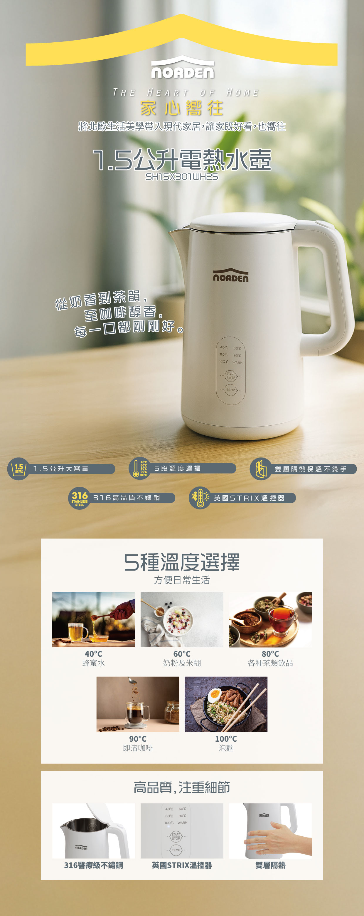 The 1.5L electric kettle features 316 medical grade stainless steel, British STRIX thermostat for precise temperature control, and double wall insulation for safety. With five temperature options, it offers convenience in daily life