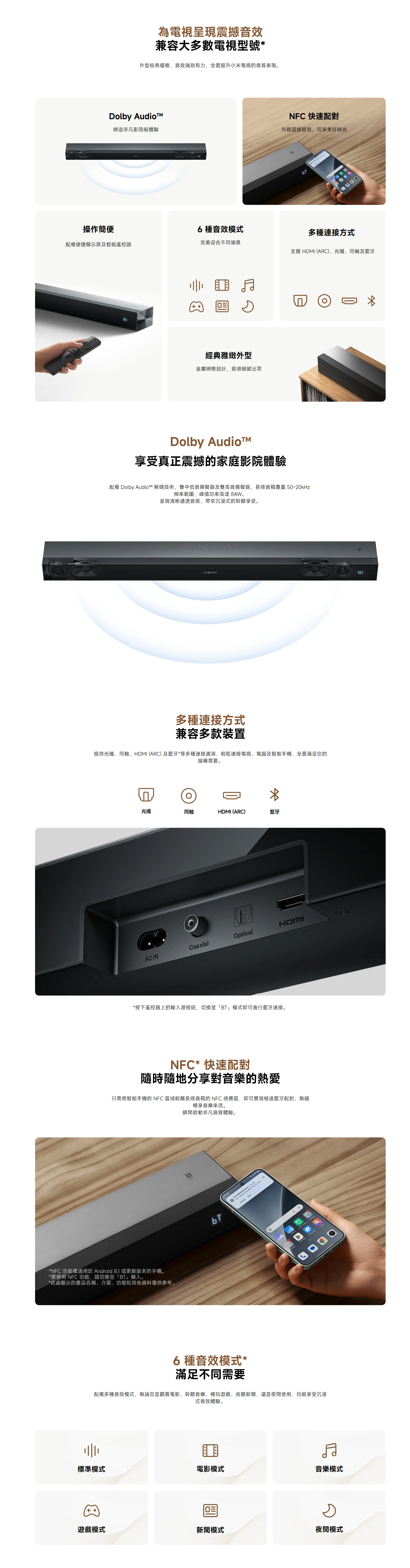 XiaomiSoundbar Pro 2.0 ch: Perfect TV companion with extraordinary sound quality! 1. NFC fast pairing with a simple tap for effortless connection 2. Six audio modes to meet your various needs
