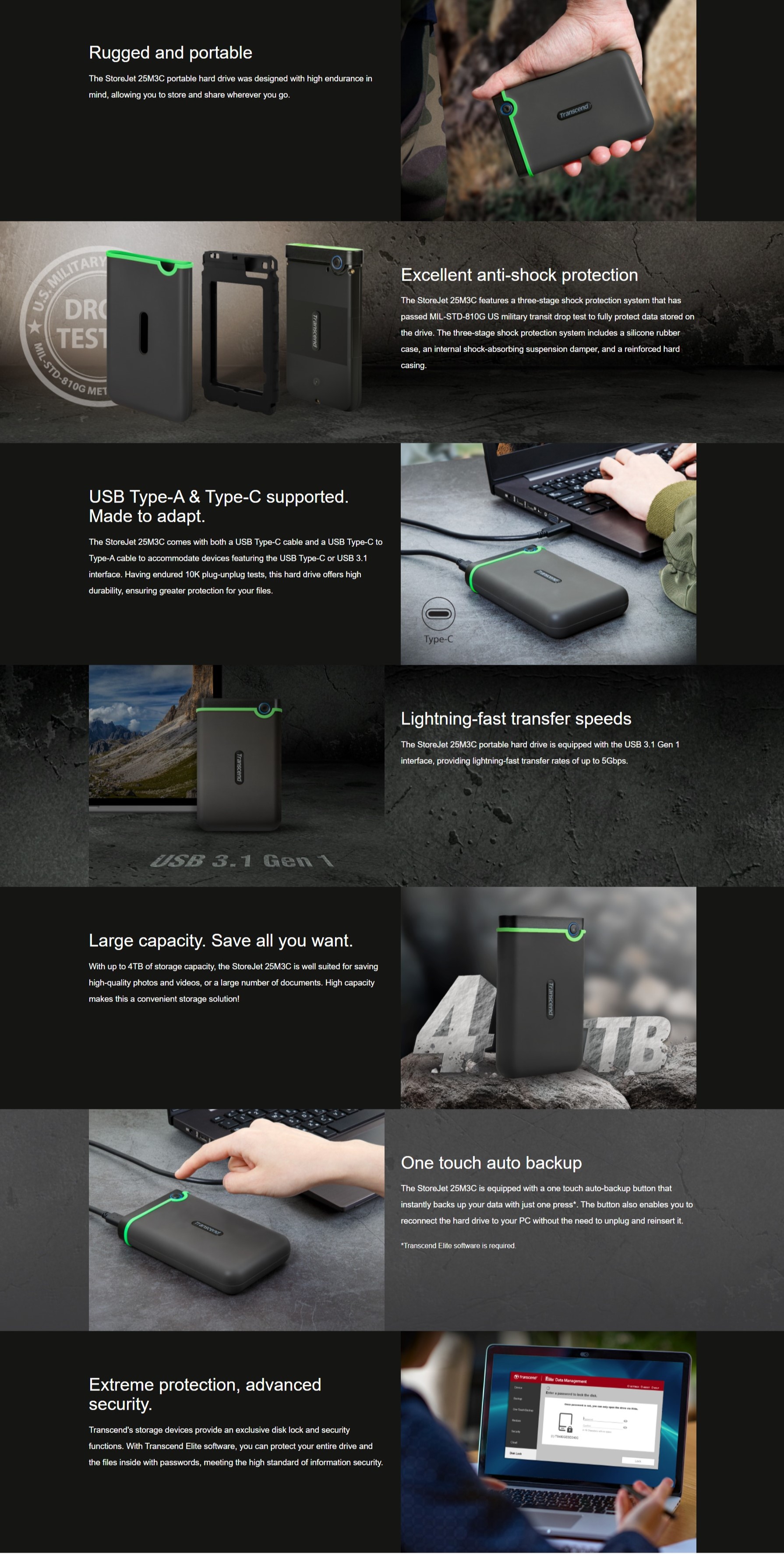 Transcend's StoreJet 25M3 ruggedized portable hard drive combines supreme shock-resistant qualities with the USB 3.1 Gen 1 interface, allowing for ultra-fast file transfers and the highest level of anti-shock protection.