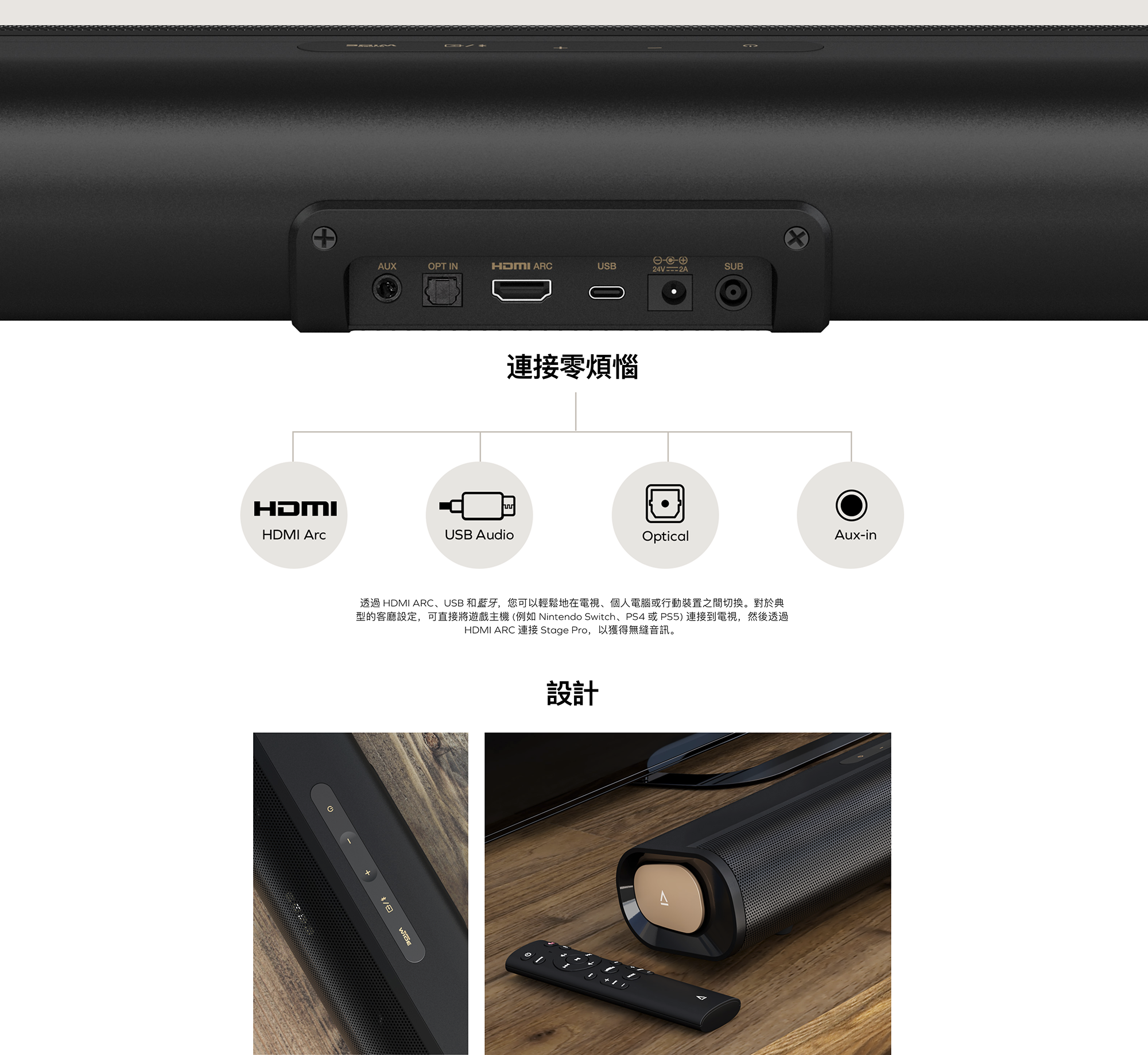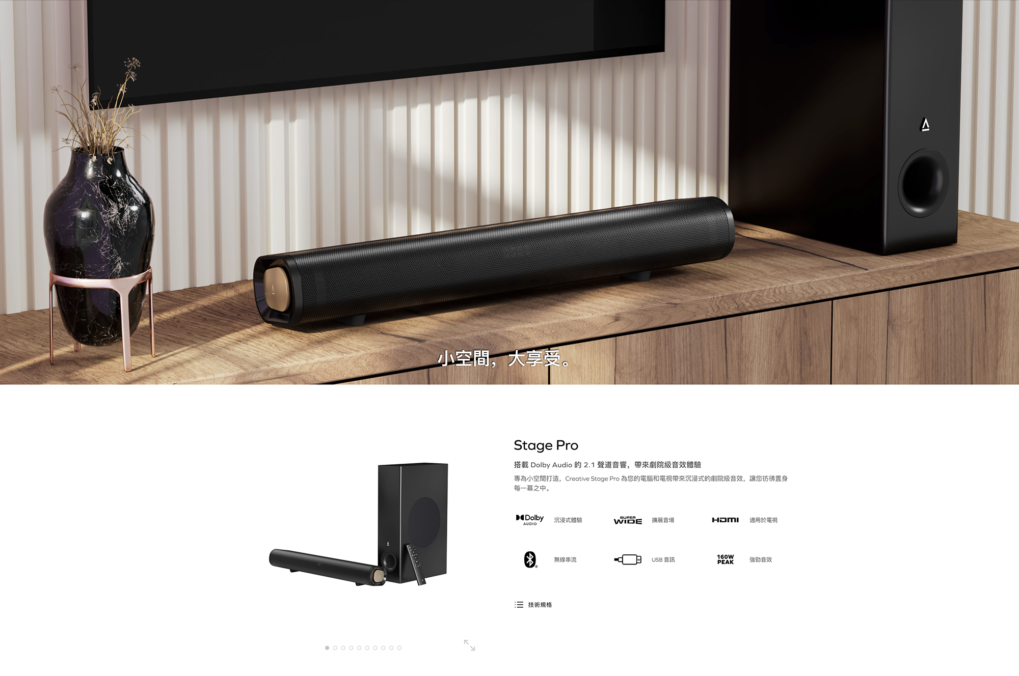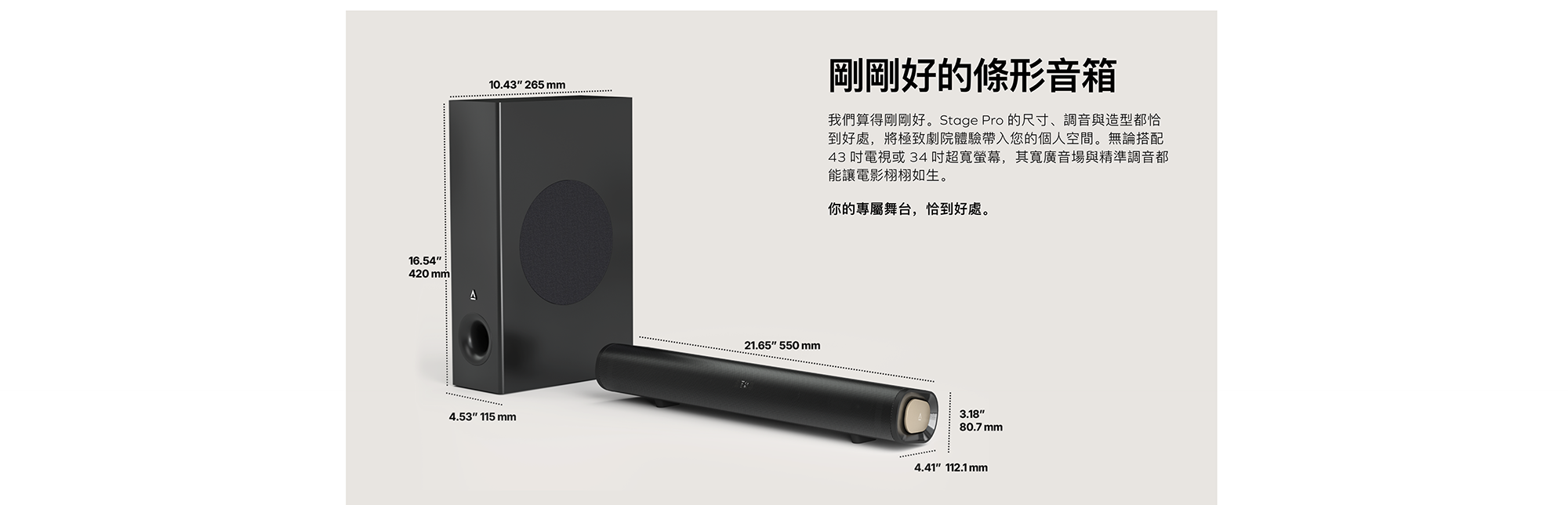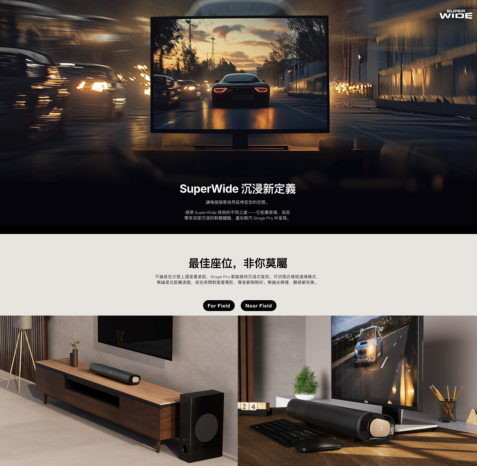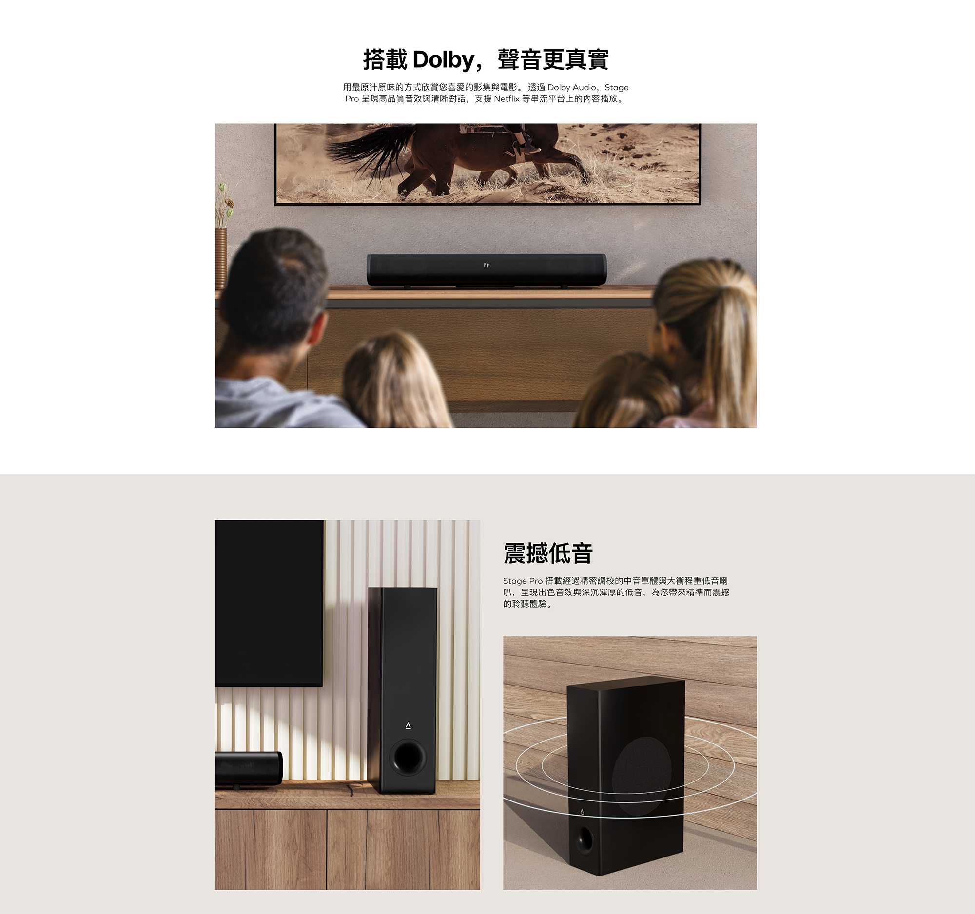 Far Field / Near Field can switch between near-field and far-field modes. Through Dolby Audio, Stage Pro presents high-quality sound and clear dialogue, with precisely tuned midrange units and large-excursion subwoofers.