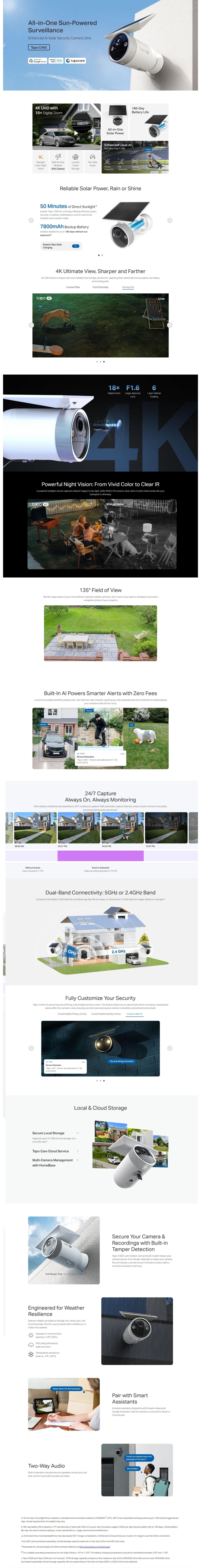 Tapo C465 is a battery-powered outdoor security camera with an integrated solar panel for continuous operation, delivering 4K 8MP UHD video resolution.