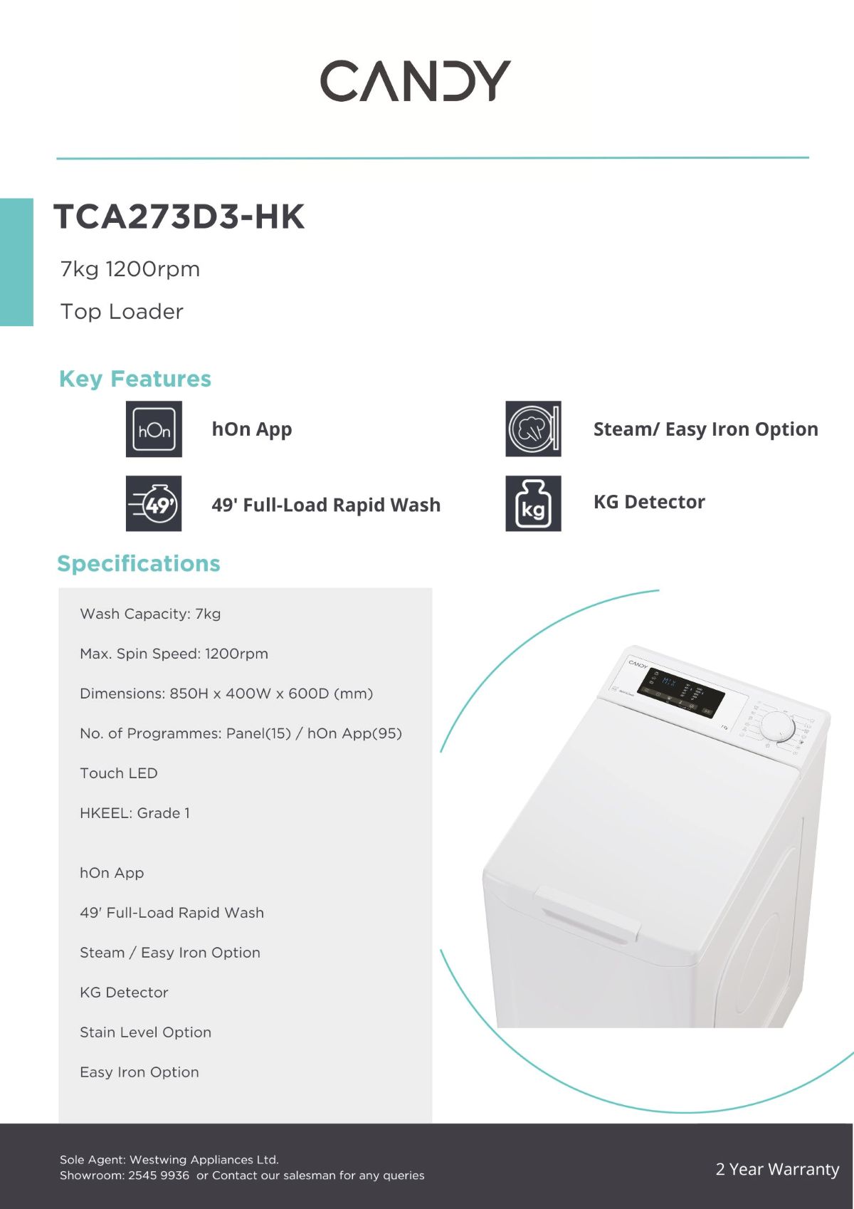 TCA273D3-HK 7kg / 1200rpm Top Load Washer / 49' Full Load Rapid Wash / hOn Mobile App