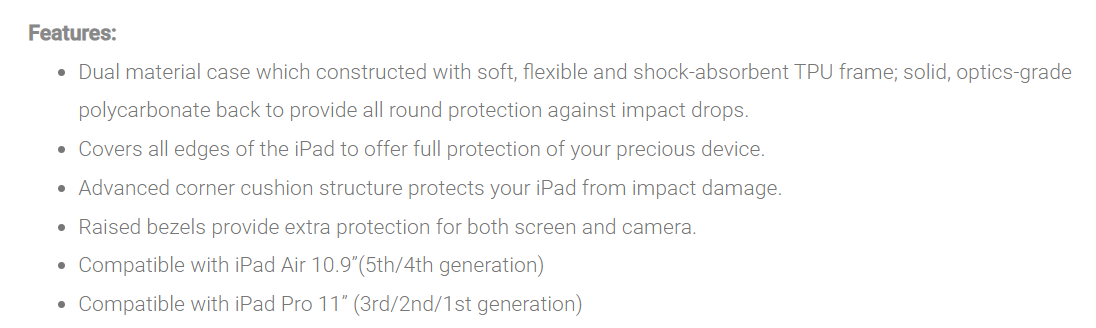 | Special Feature | Special Feature Advanced corner cushion structure protects your iPad from impact damage | Special Feature - | Special Feature - | Special Feature - |