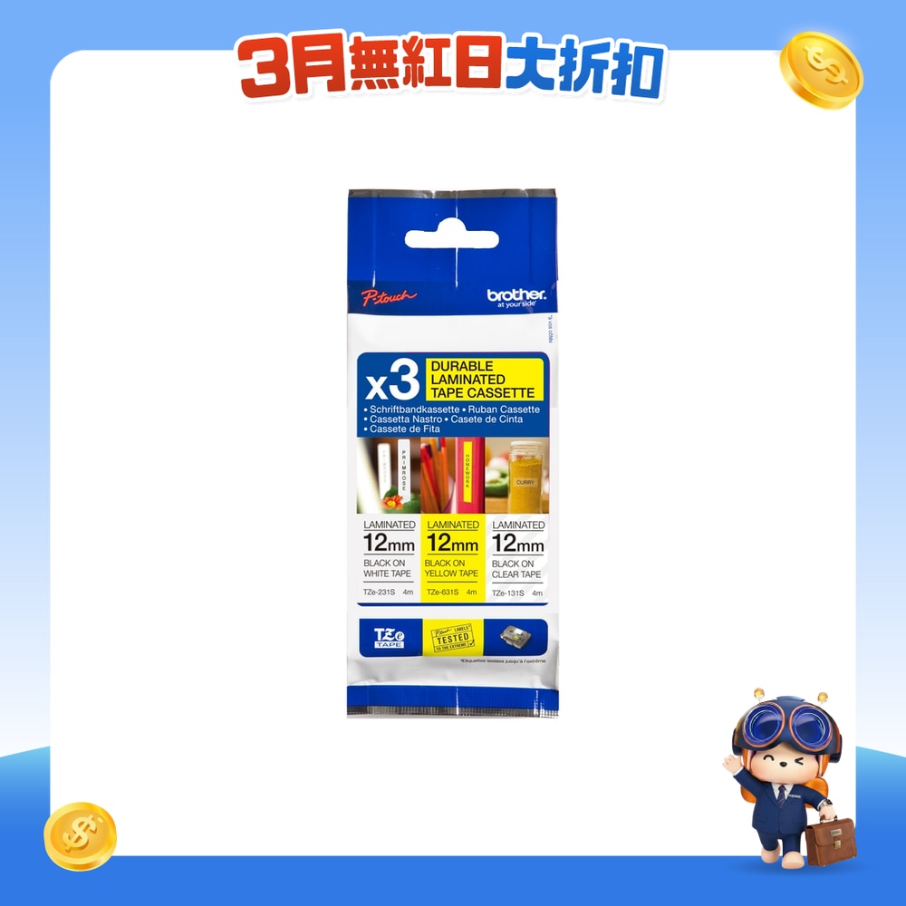 12mm Basic value pack x 3 pcs [TZe231 Black on White (4m) + TZe631 Black on Yellow (4m) + TZe131 Black on Clear (4m)]
