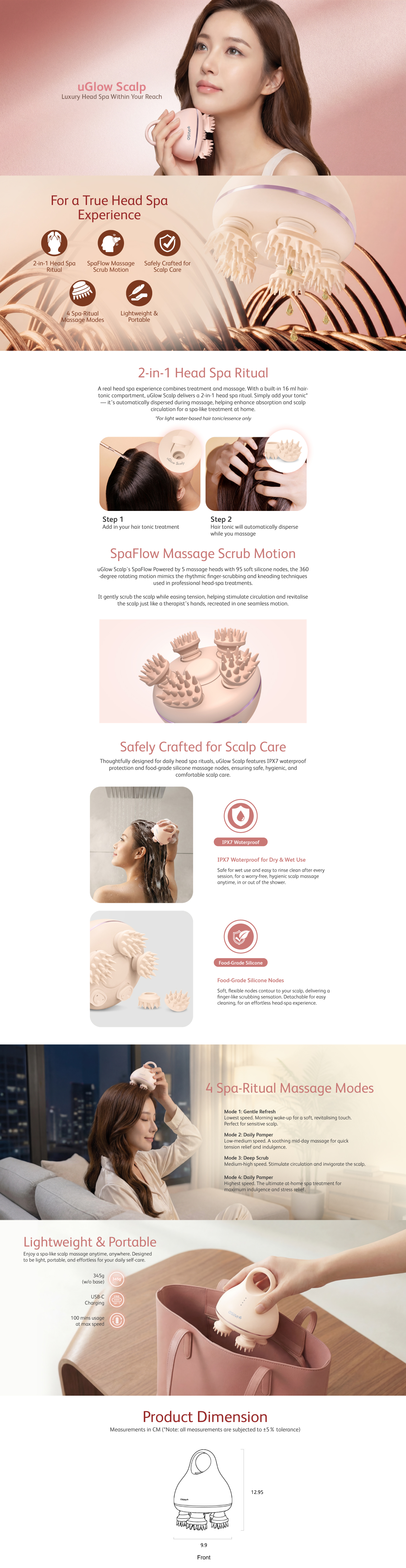 Refresh your scalp with uGlow Scalp’s 5 rotating heads and 95 soft-touch nodes working with your favourite tonic for a calming head‑spa