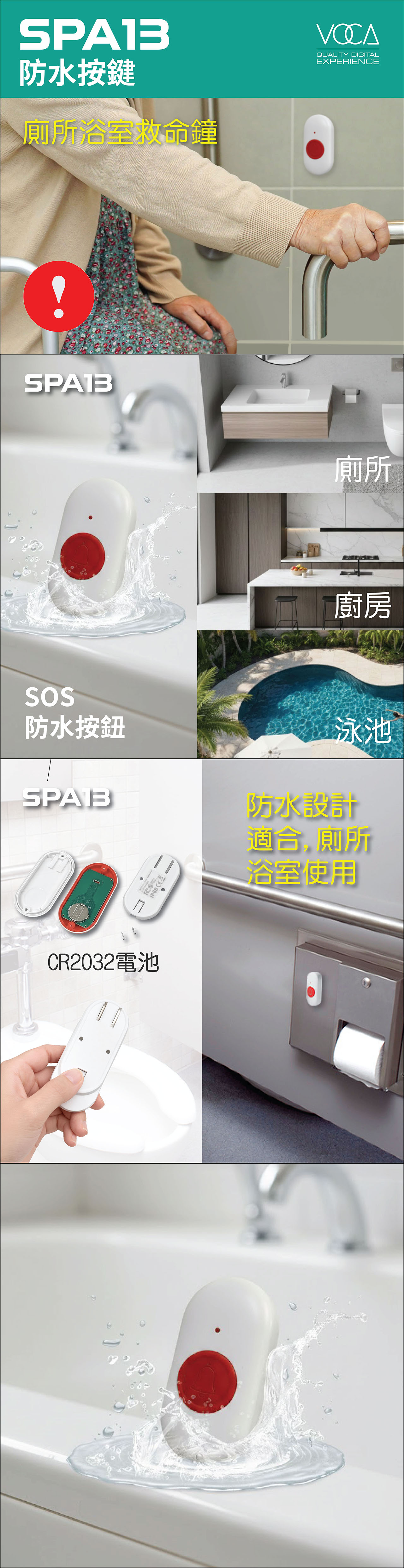 VOCA SPA13 Emergency Waterproof Button for high-risk home areas like bathrooms/toilets. Waterproof body with large easy-press button lets seniors quickly send distress signals in damp/emergency situations, boosting home safety.