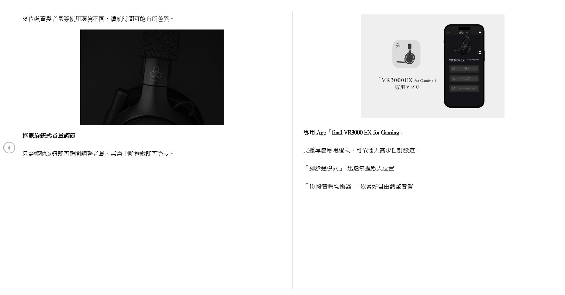电竞声学再进化! final推出头戴式无线电竞耳机 VR3000EX,实现超广3D声学空间及超低延迟,助你以声制胜! 以声制胜,主宰战局 — 为「胜利」而诞生的电竞耳机, 透过忠实重现游戏与内容的「3D立体音场超广音场」,带来深度沉浸感与高度专注力。搭载「脚步声模式」,能迅速掌握敌人位置,FPS游戏最佳利器。
